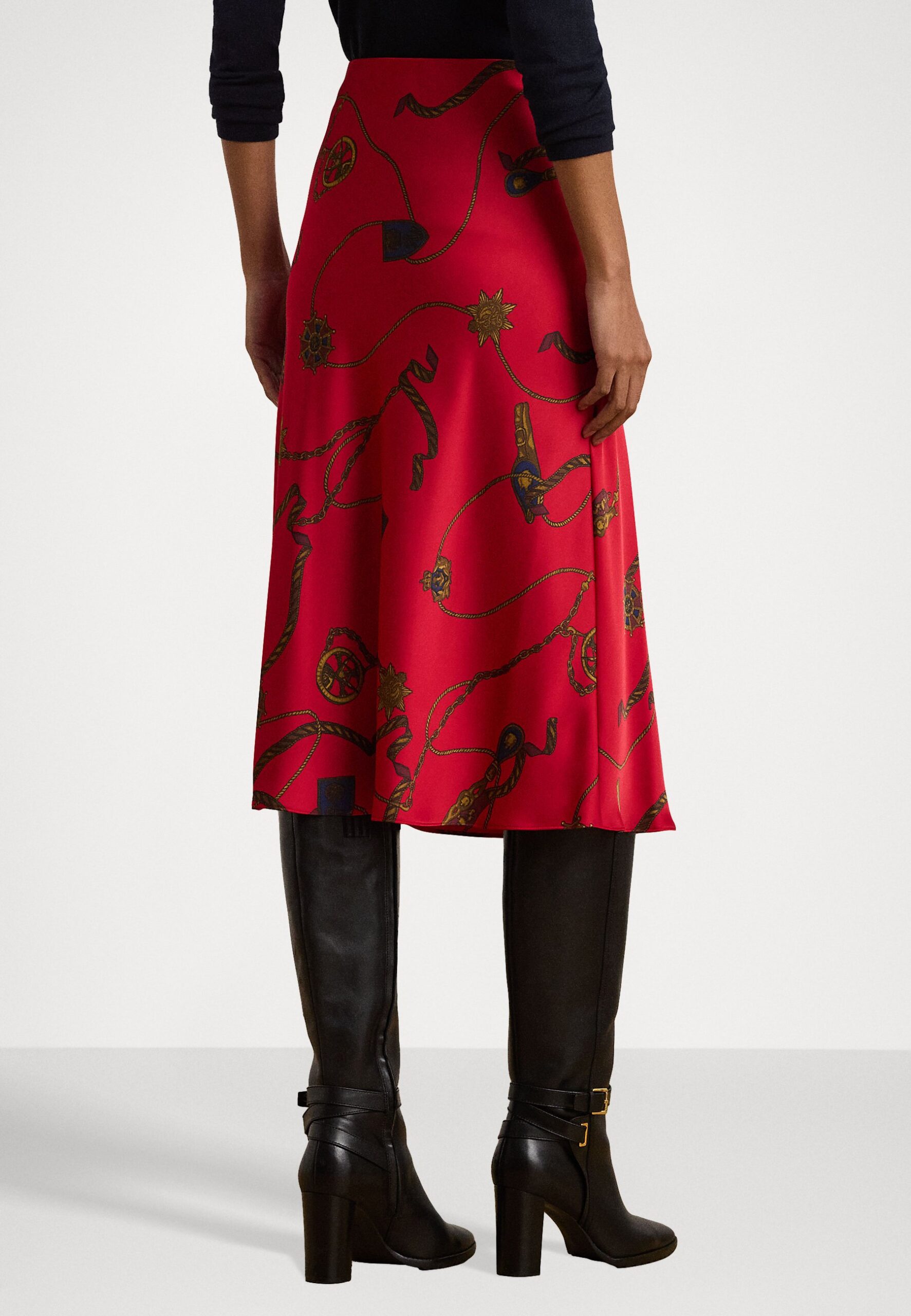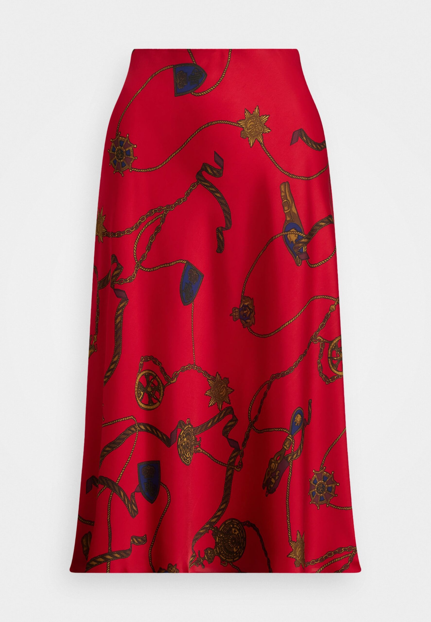 BELTING PRINT SATIN CHARMEUSE MIDI SKIRT – A-line skirt – red/multi-colored
