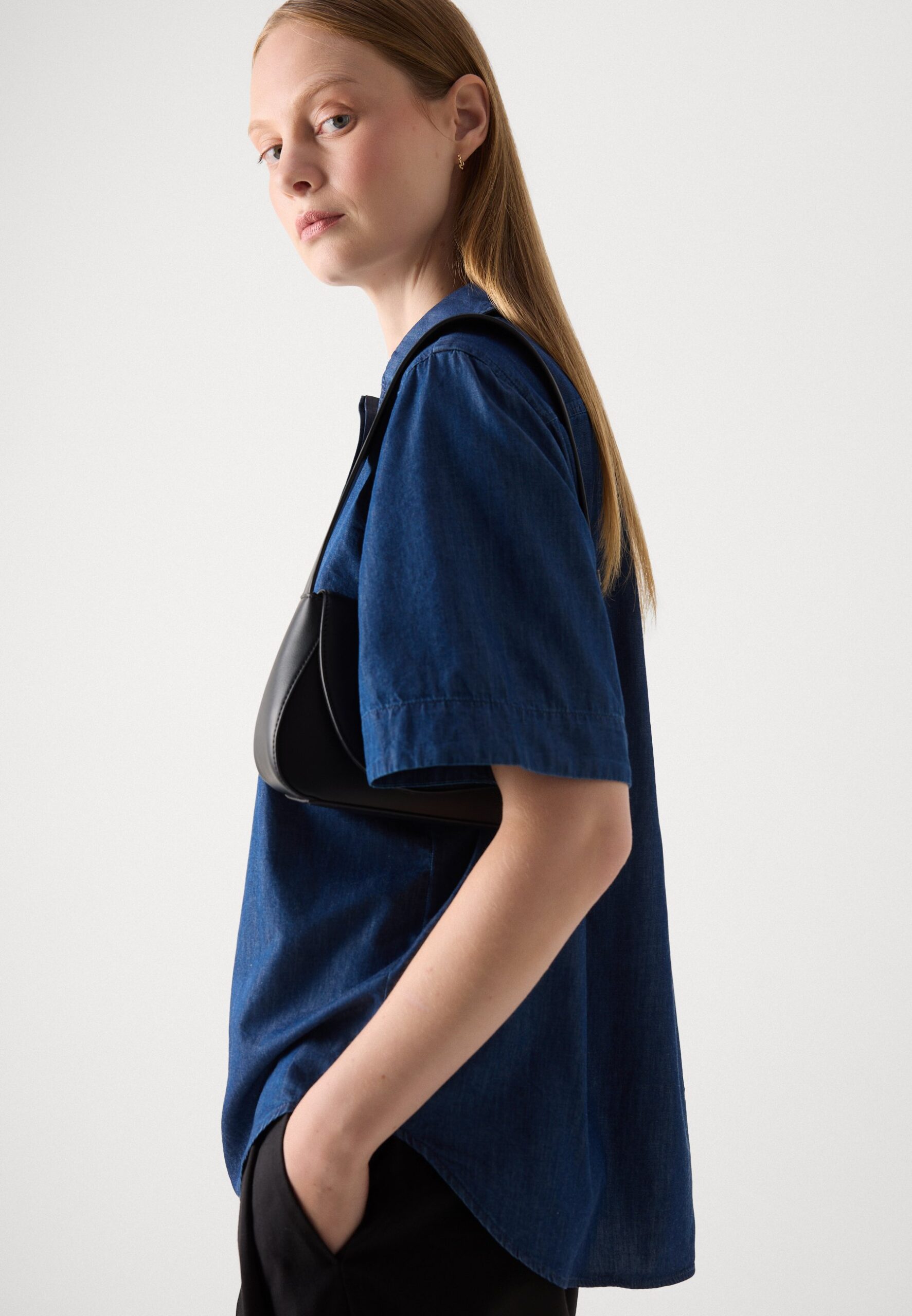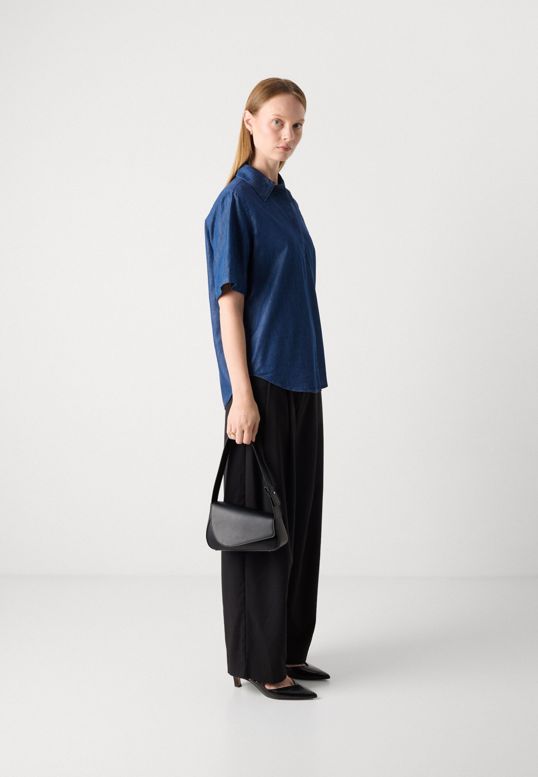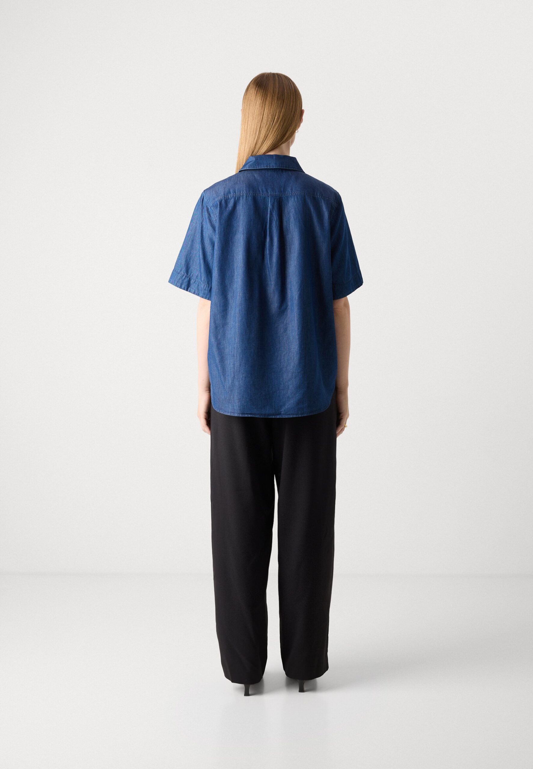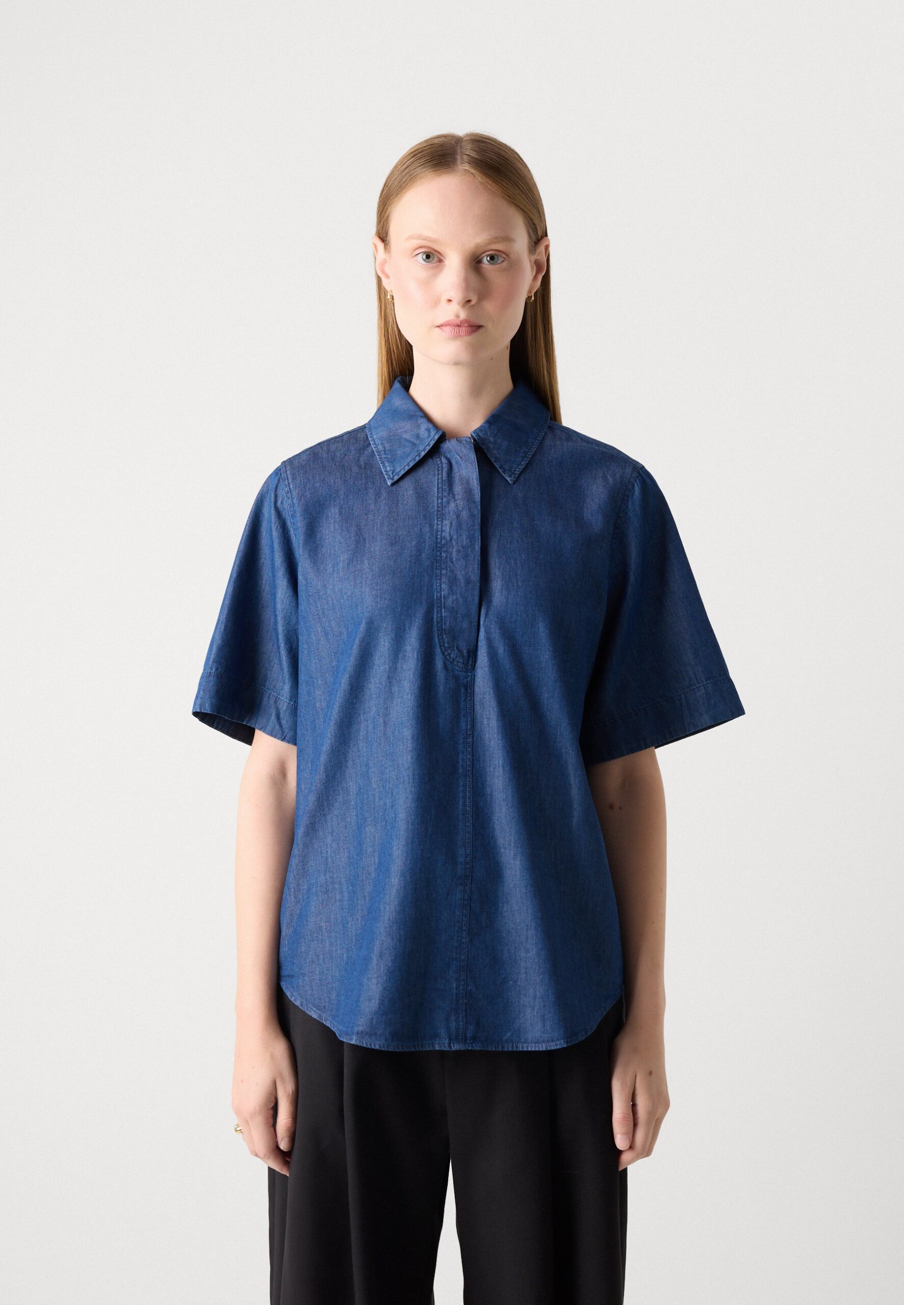 BLOUSE COLLAR ROUND HEM SHORT SLEEVE SOLID – Blouse – dark indigo denim