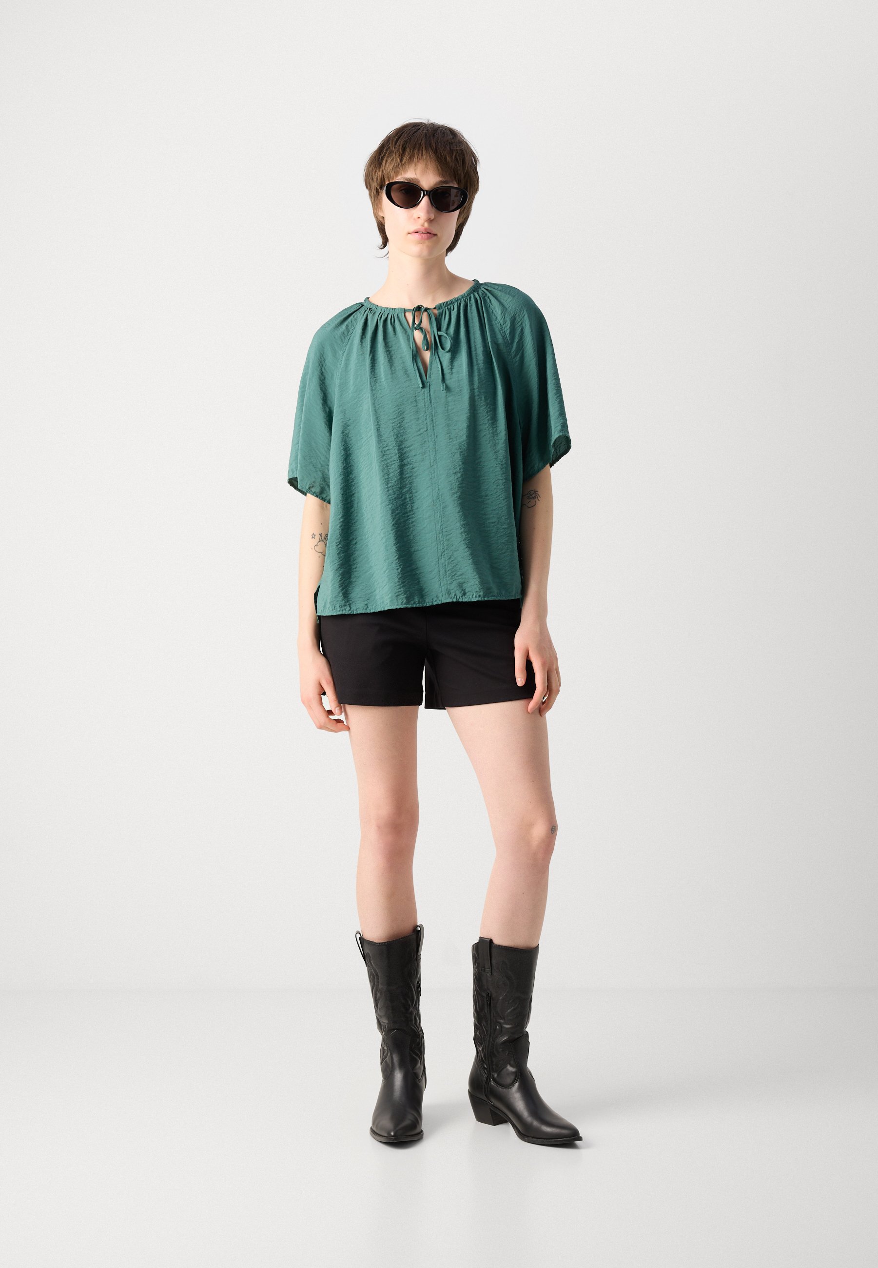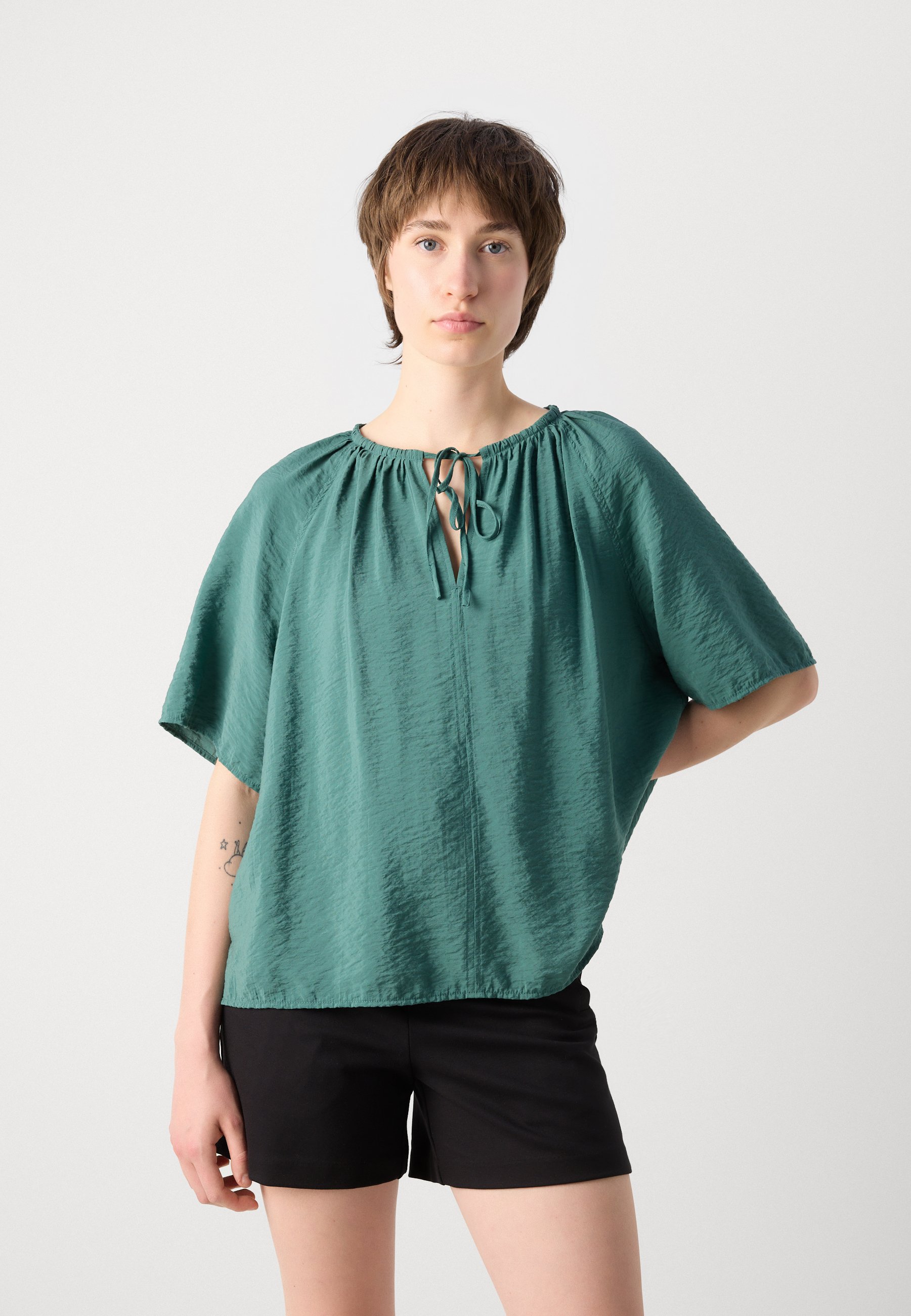 BLOUSE ROUND NECK WITH DRAWSTRING AND GATHERING SOLID – Blouse – summer pine