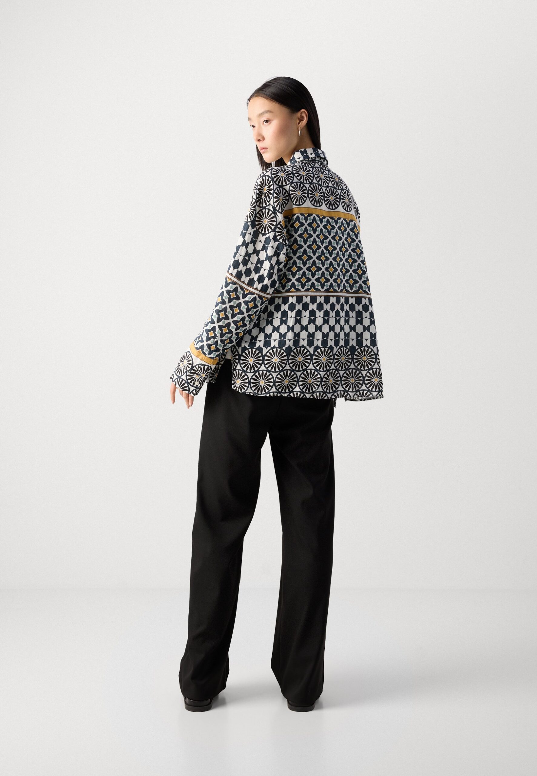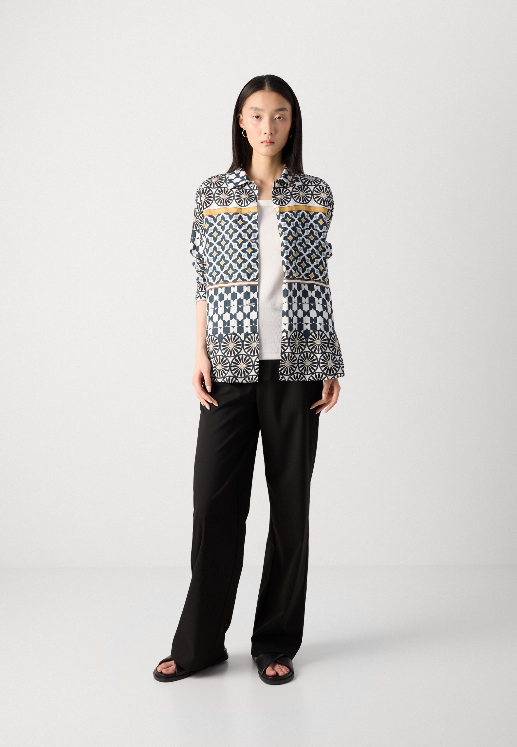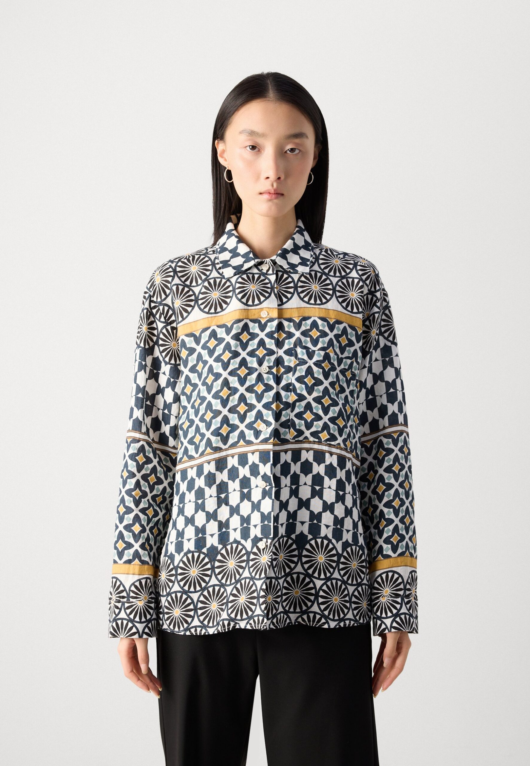 BLOUSE SHIRT COLLAR BUTTONED SLITS AT SIDE LONG SLEEVE PRINT – Button-down blouse – white/multi-color