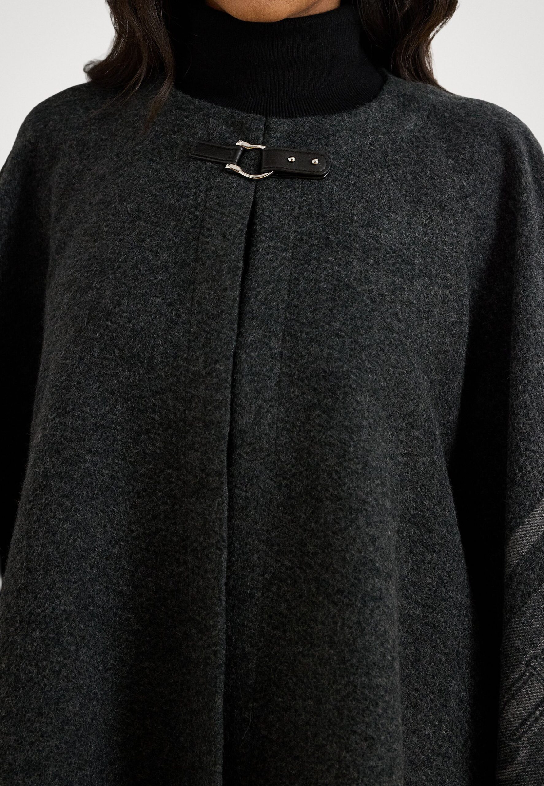 BUCKLE TRIM BELTING MOTIF JACQUARD RUANA – Cape – black