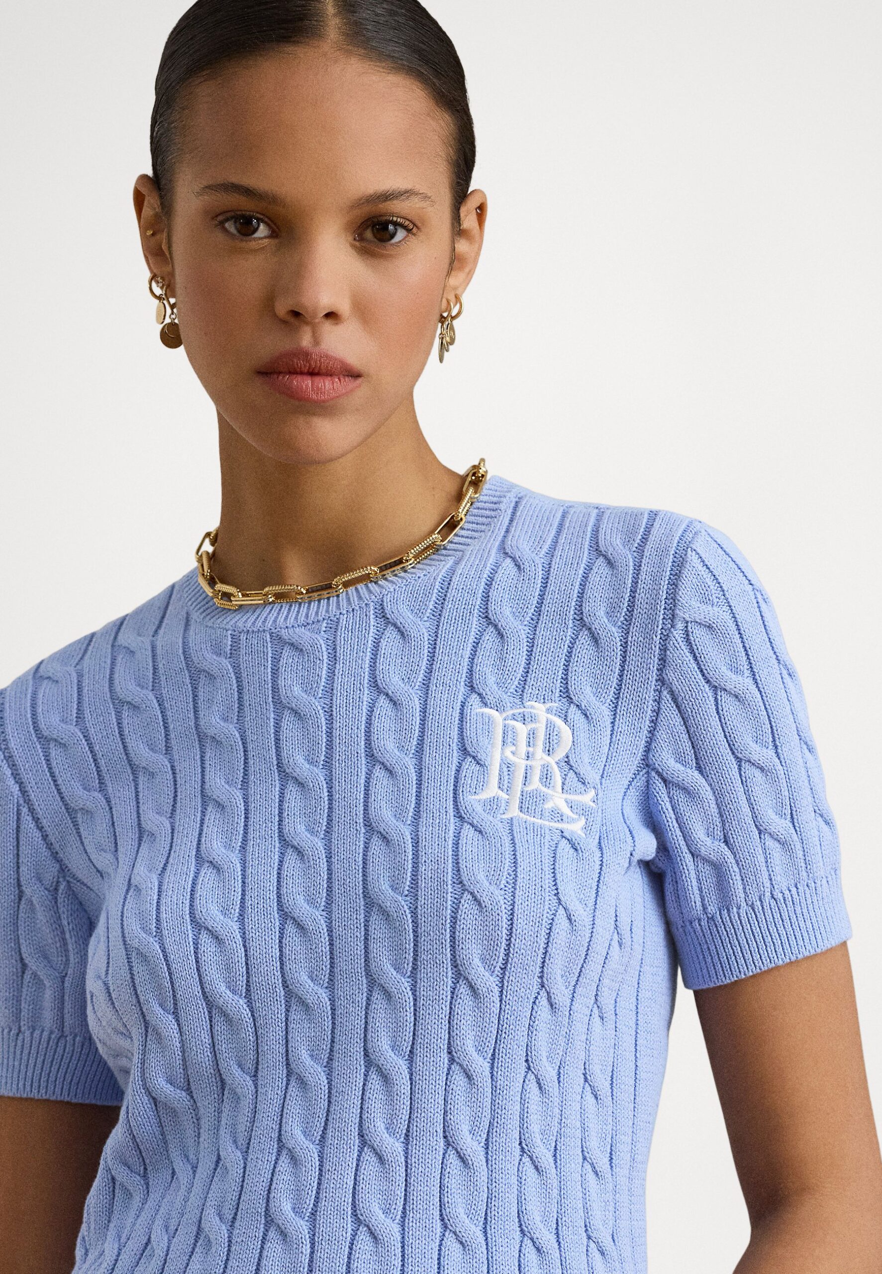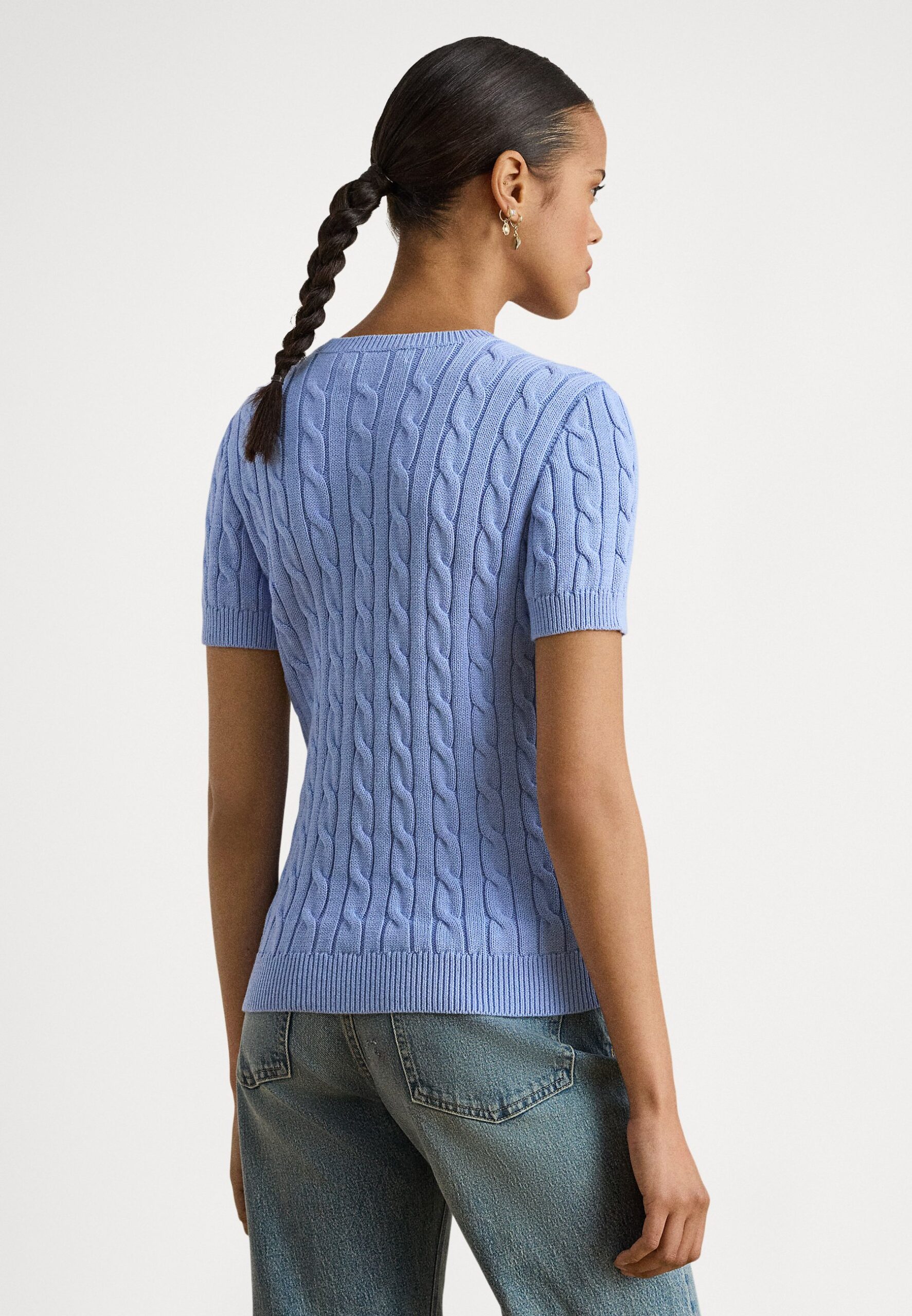 CABLE-KNIT COTTON SHORT-SLEEVE SWEATER – Basic T-shirt – banker blue