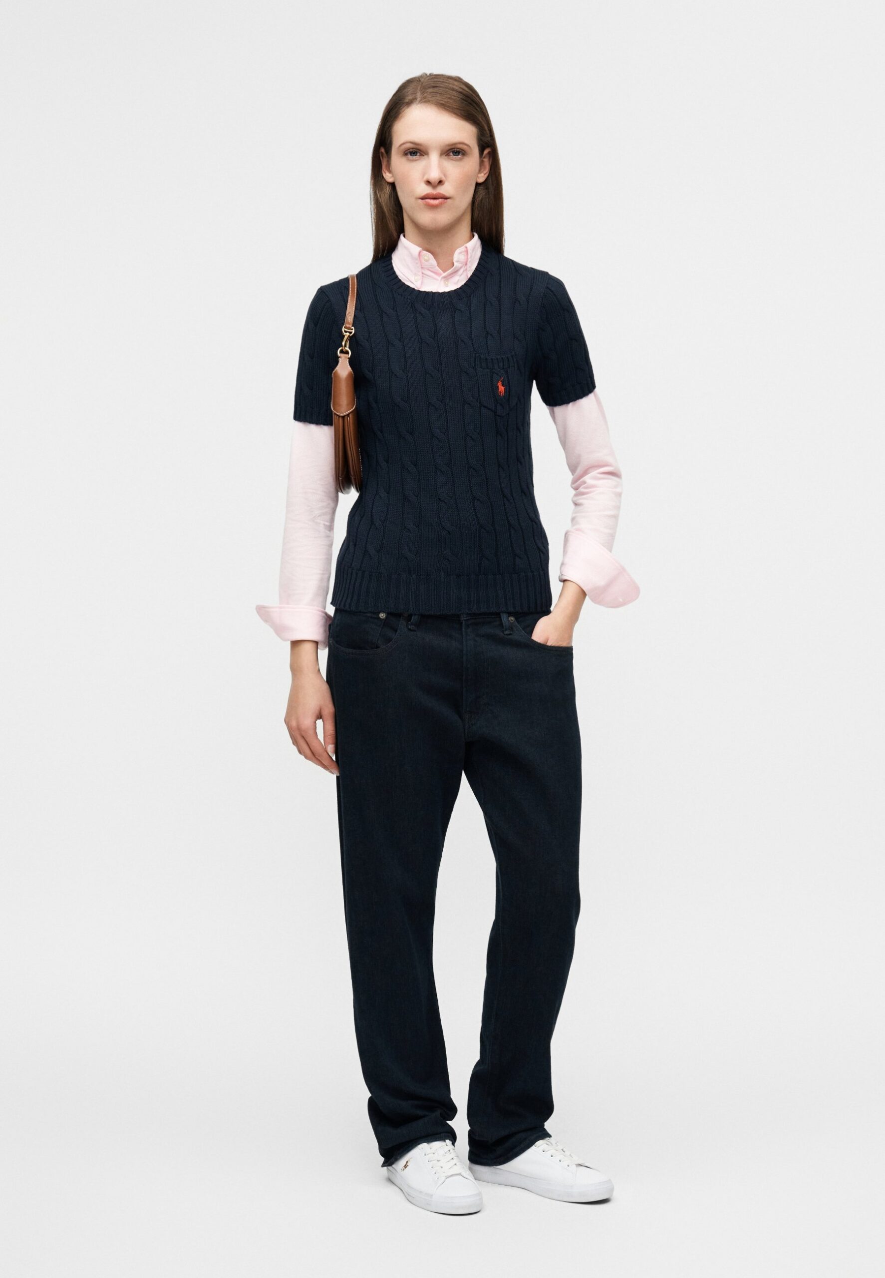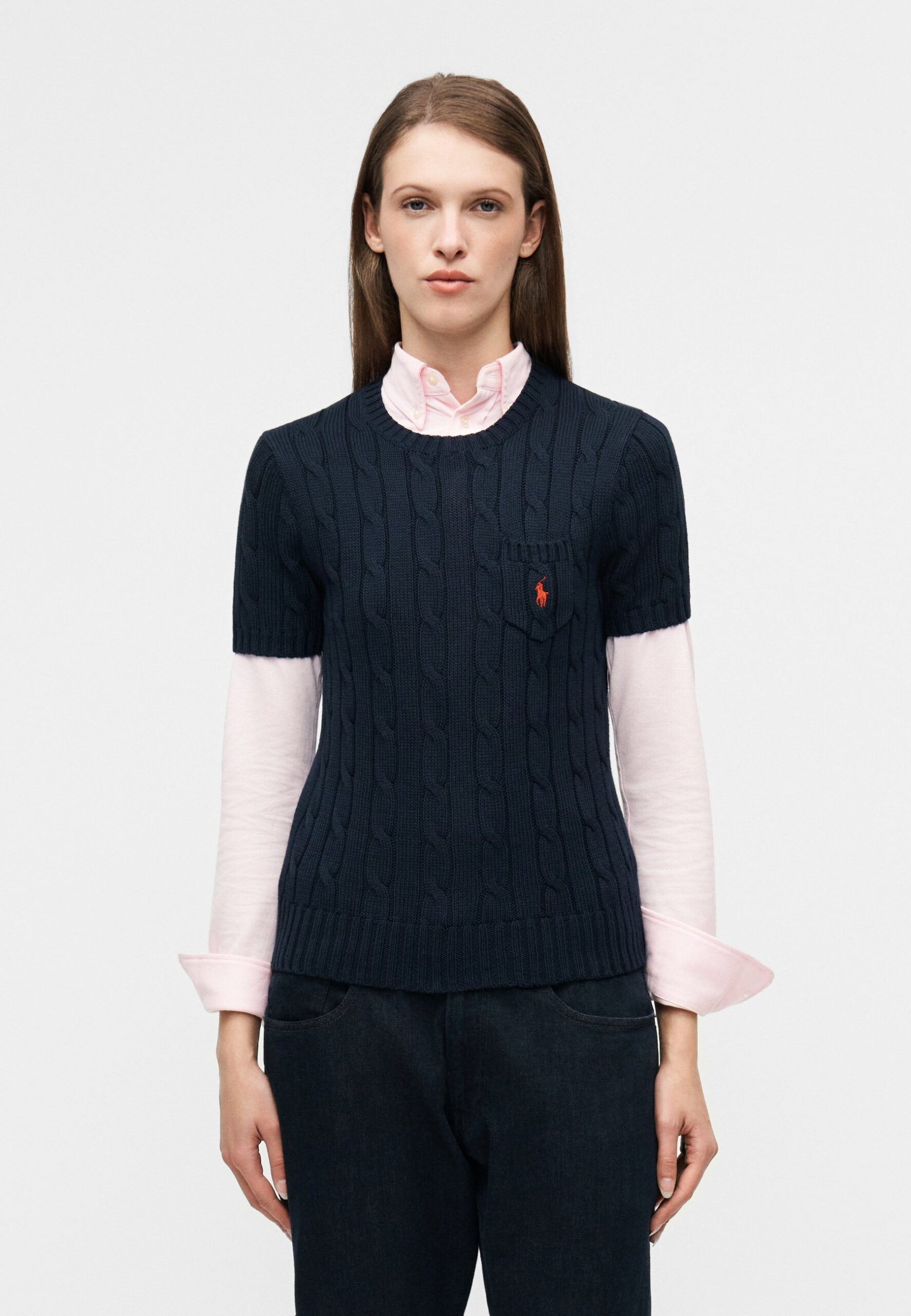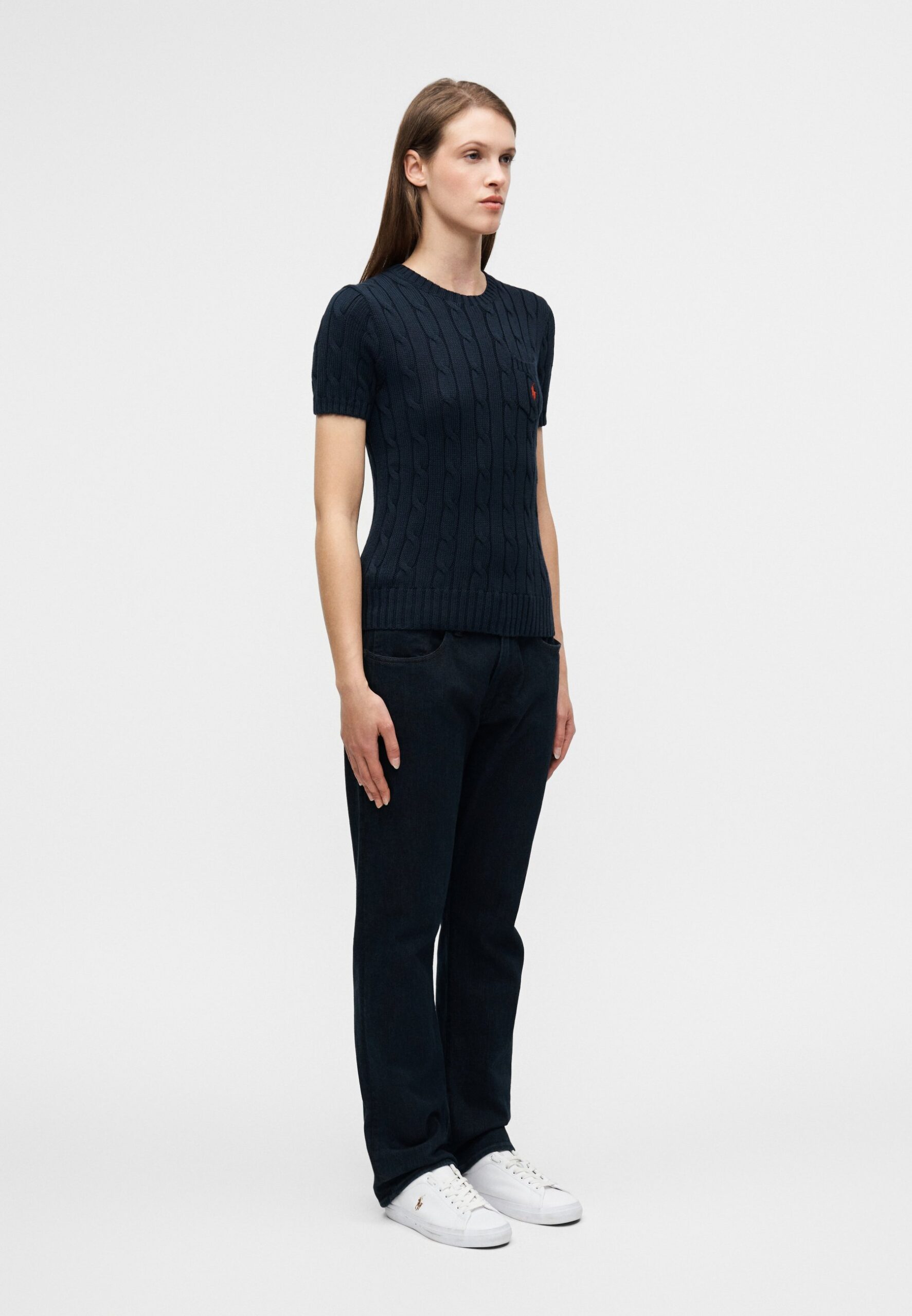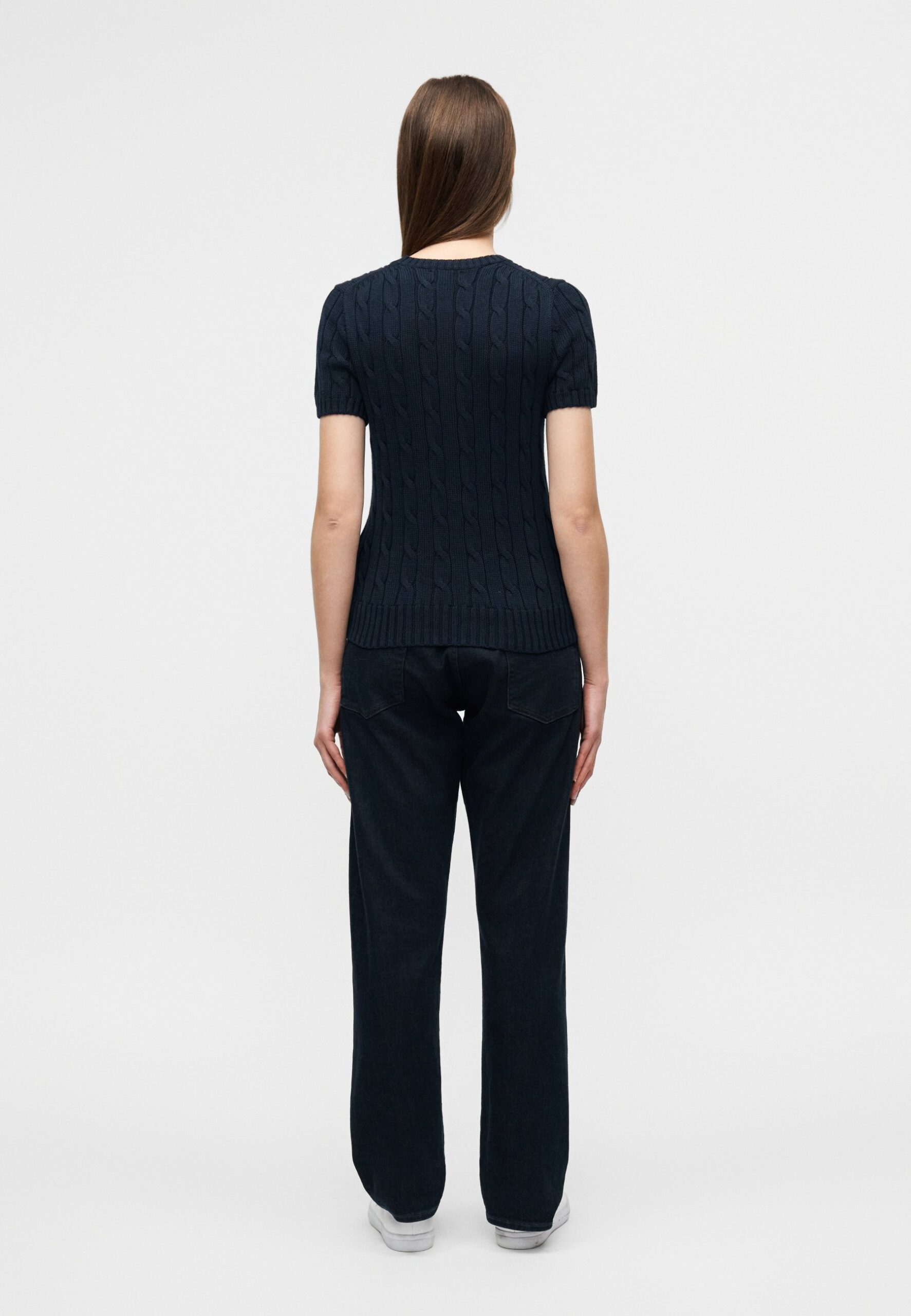 CABLE-KNIT COTTON SHORT-SLEEVE SWEATER – Basic T-shirt – hunter navy