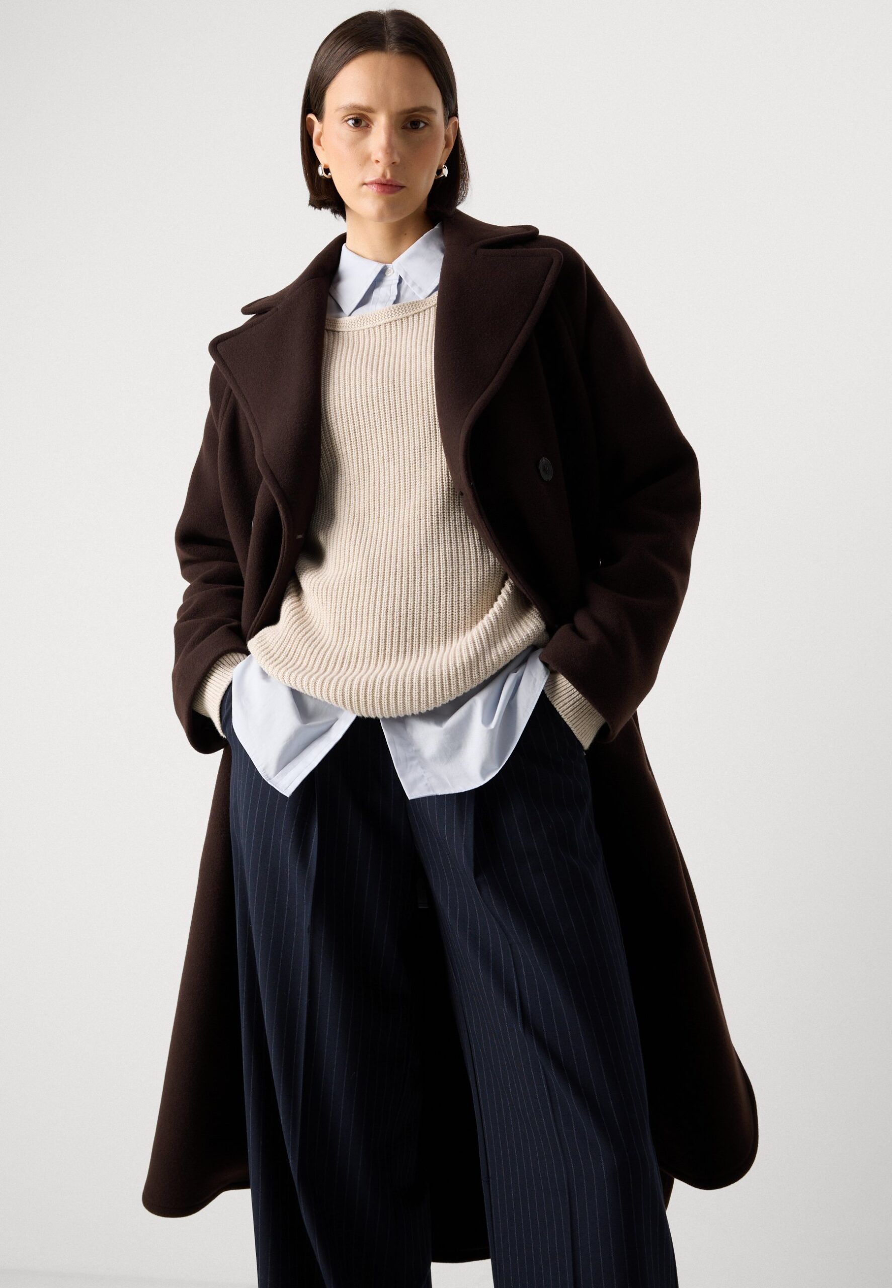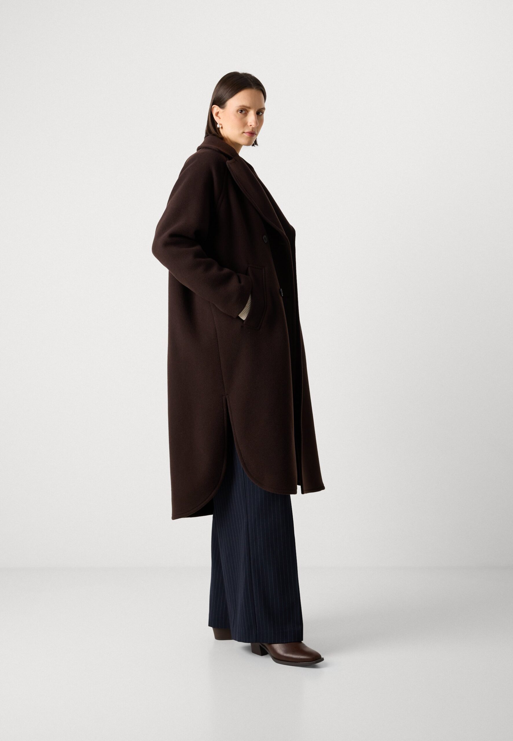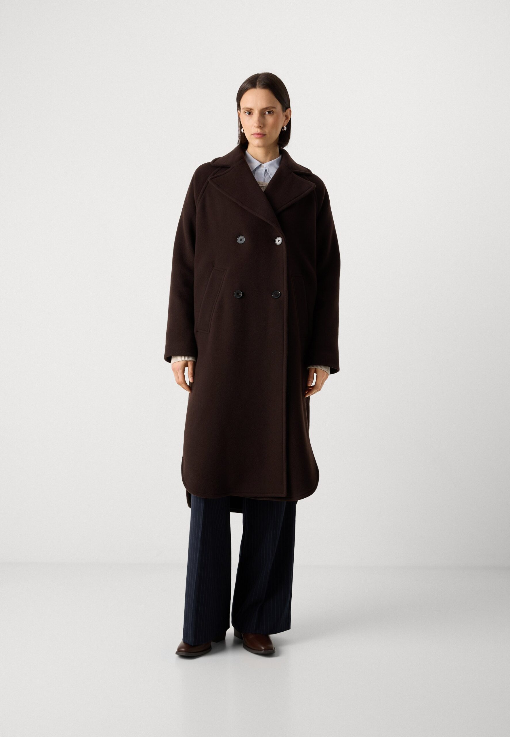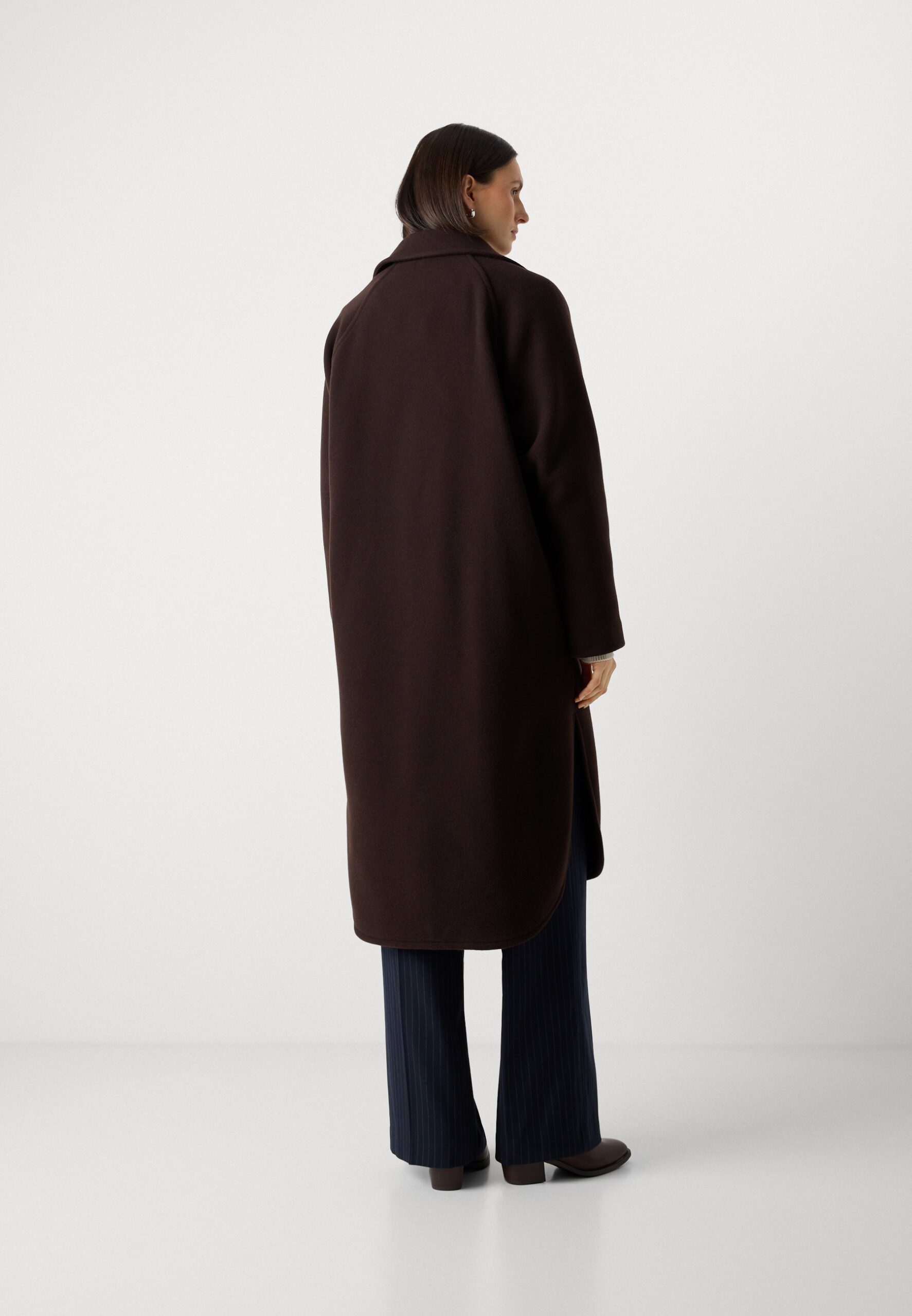 CAPE COAT DOUBLE BREASTED RAGLAN SLEEVES ROUNDED HEM – Classic coat – dark coffee