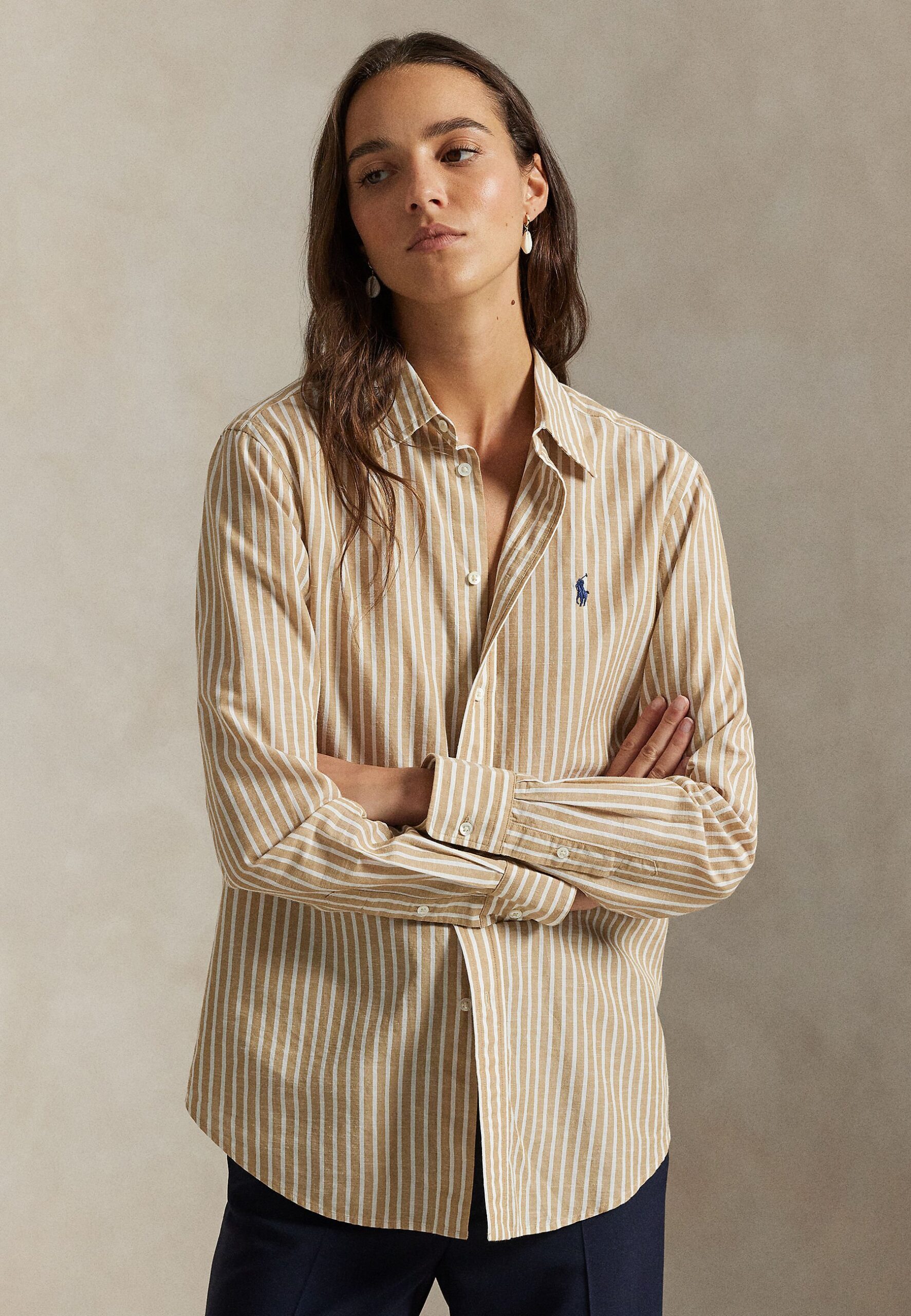 CLASSIC FIT STRIPED COTTON-LINEN SHIRT – Button-down blouse – classic camel/white