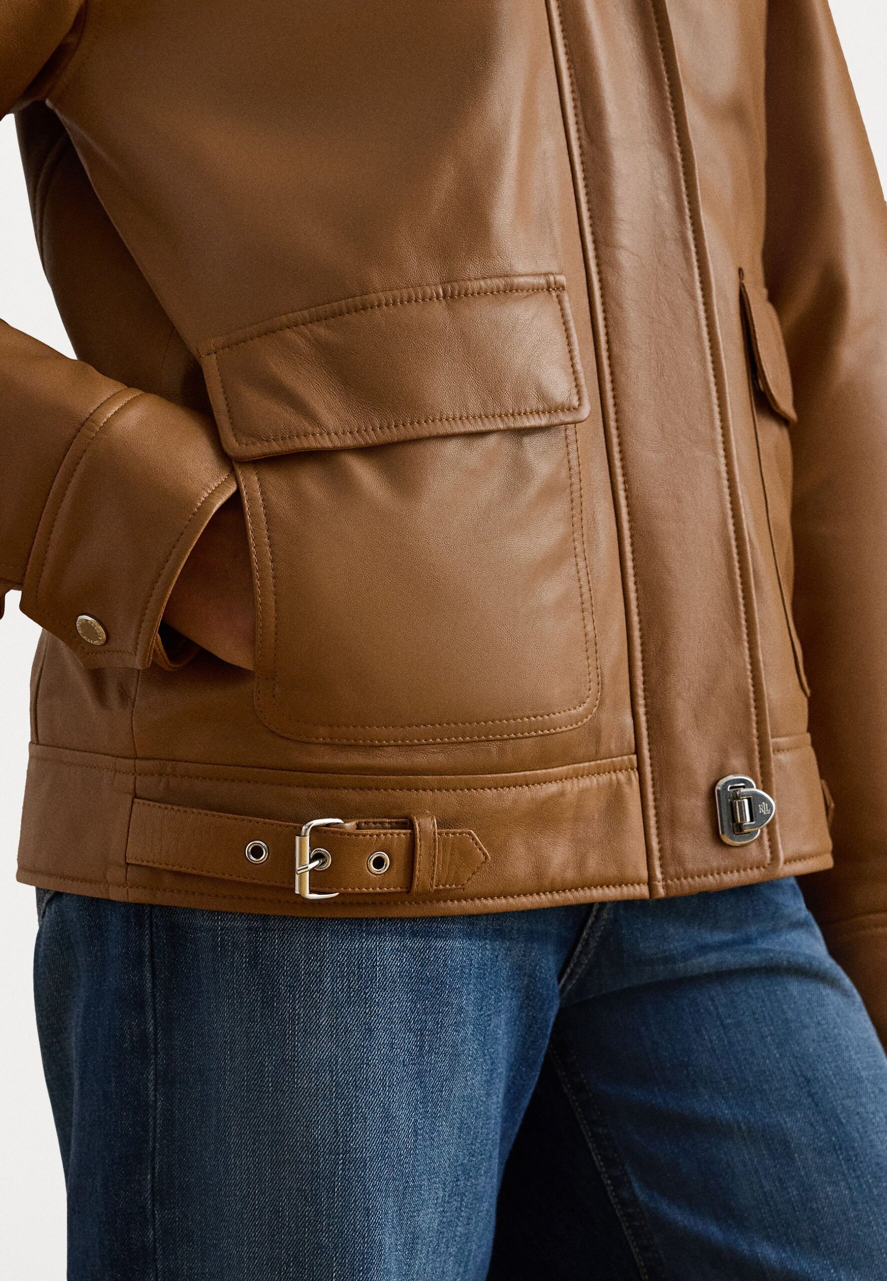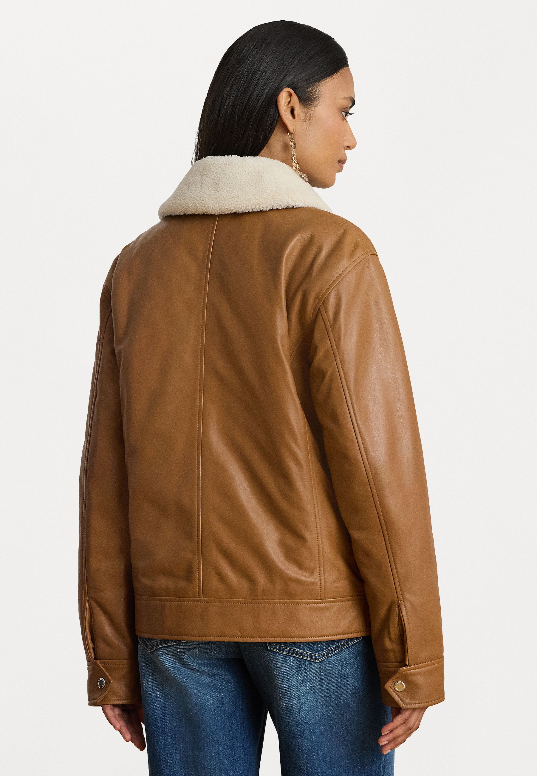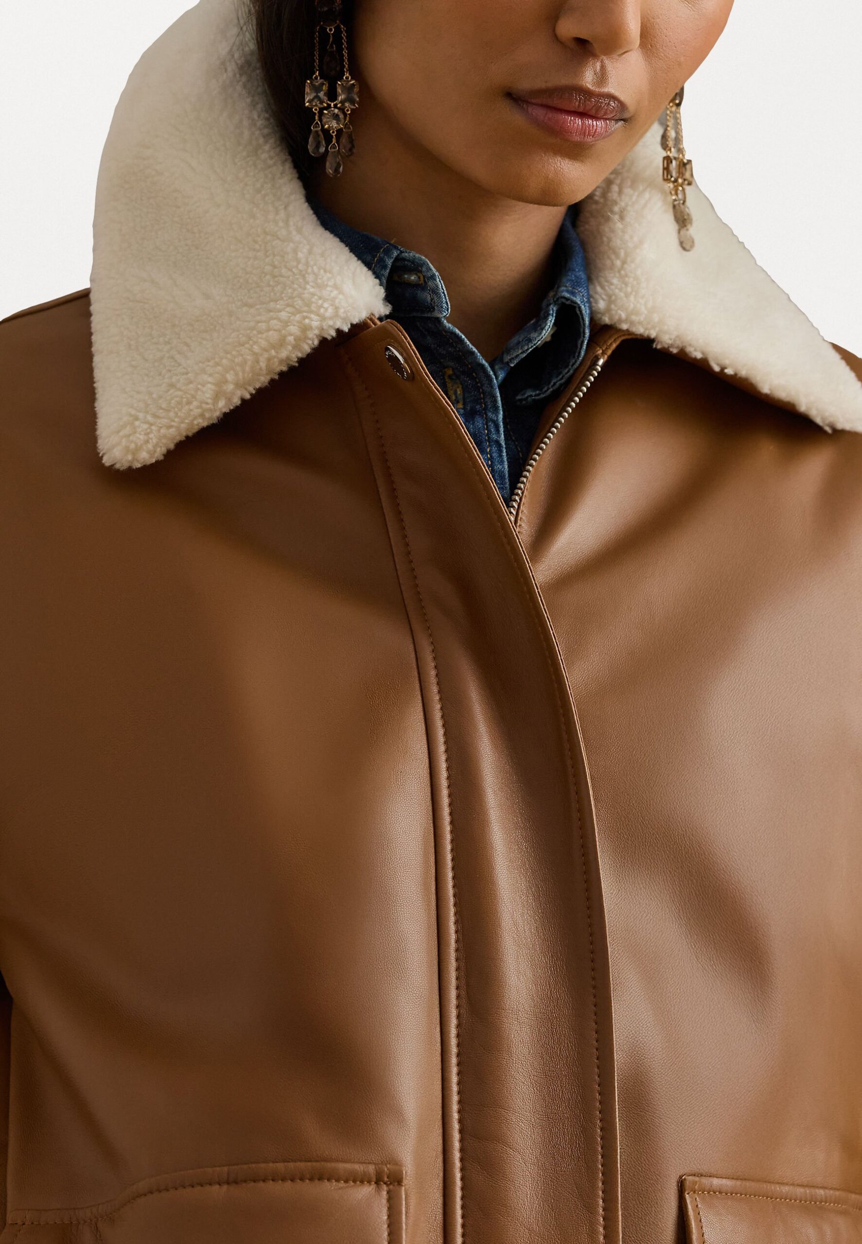 FAUX-SHEARLING-TRIM LEATHER JACKET – Bomber Jacket – cuoio/masc cream