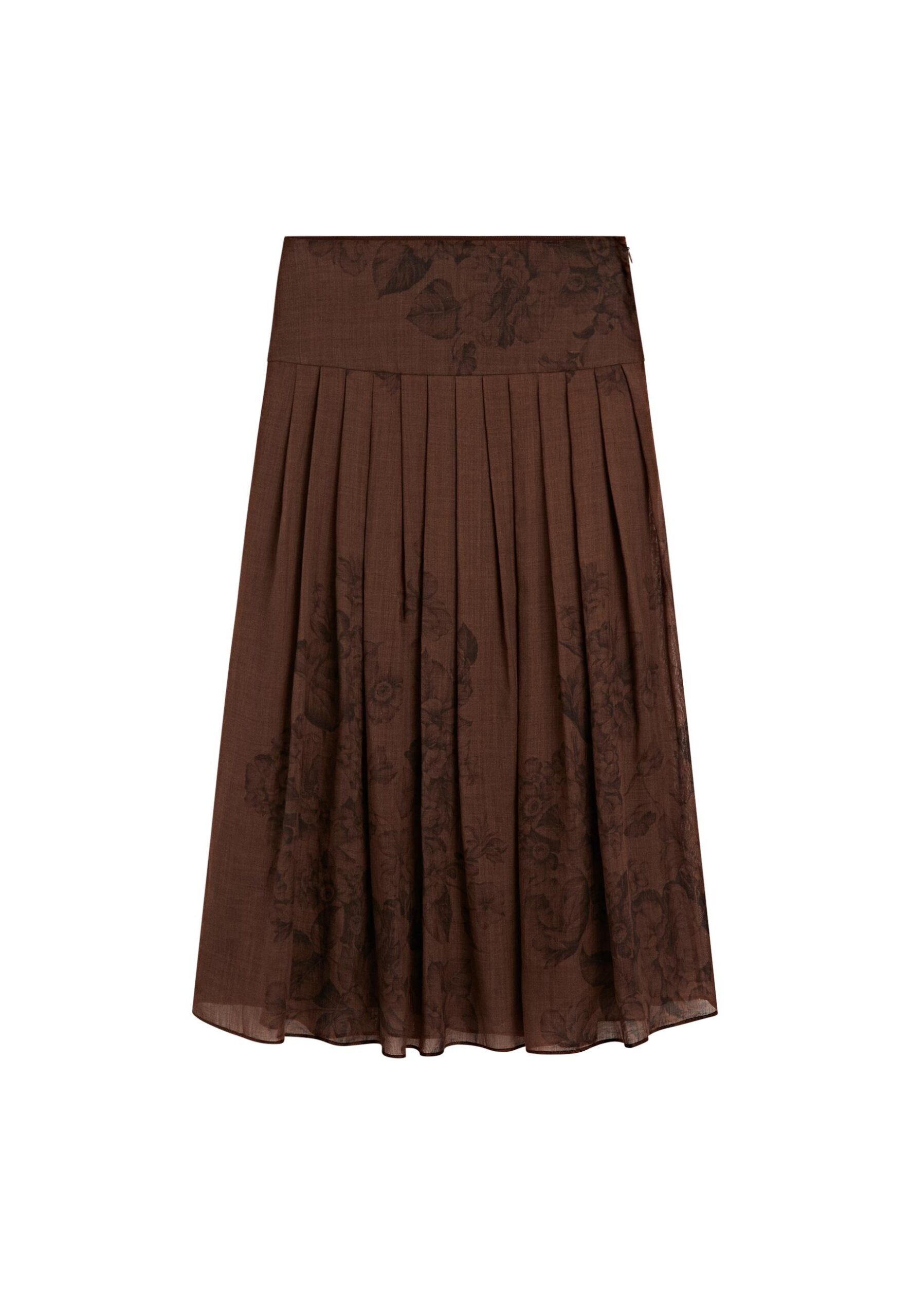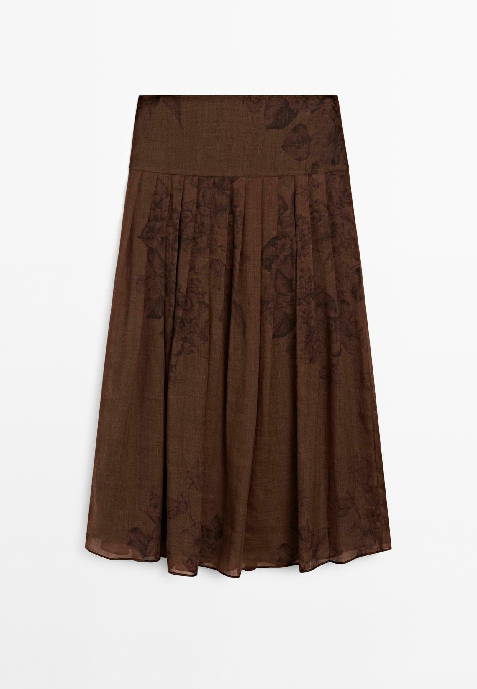 FLARED FLORAL PRINT MIDI – Pleated skirt – mottled dark brown