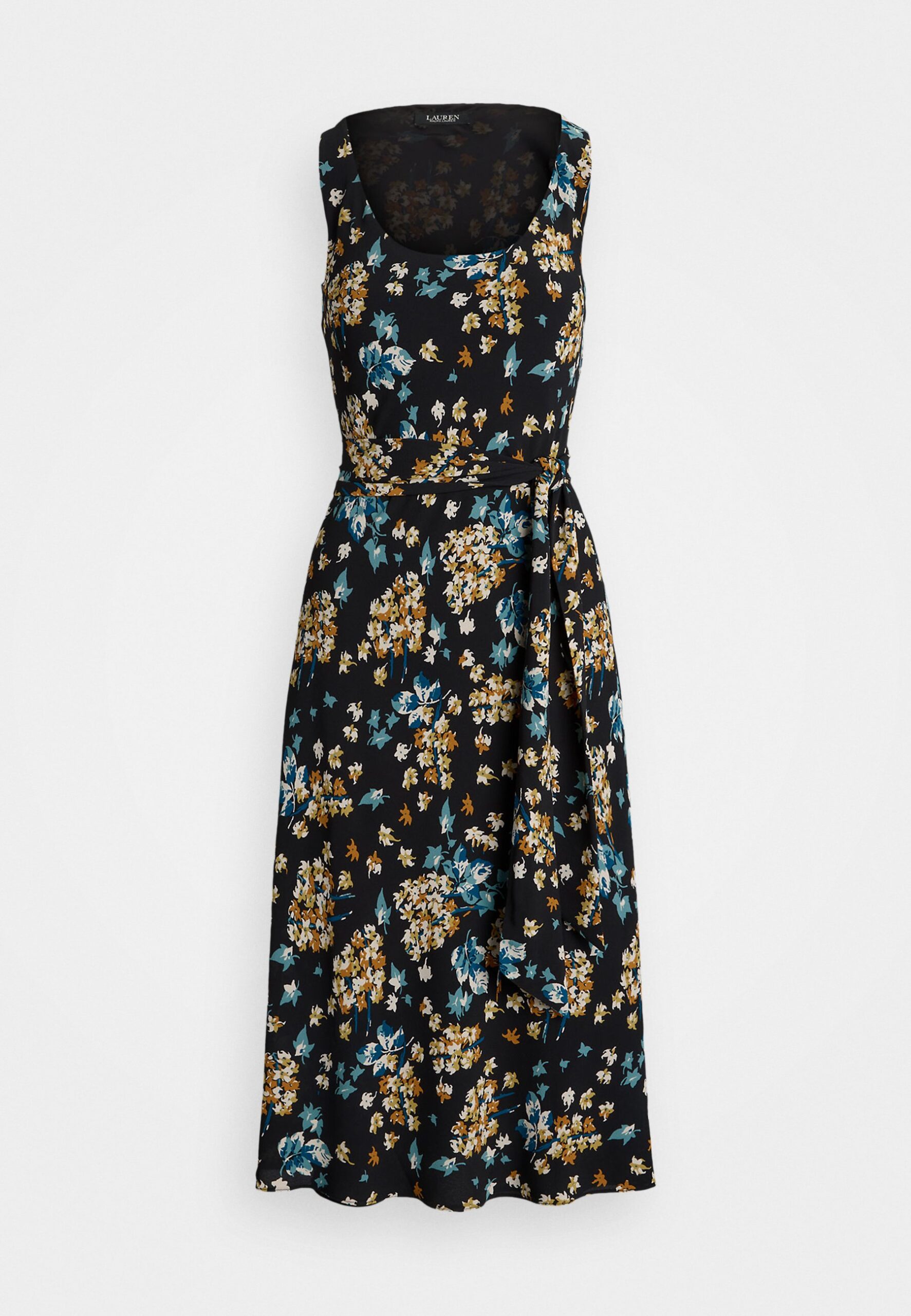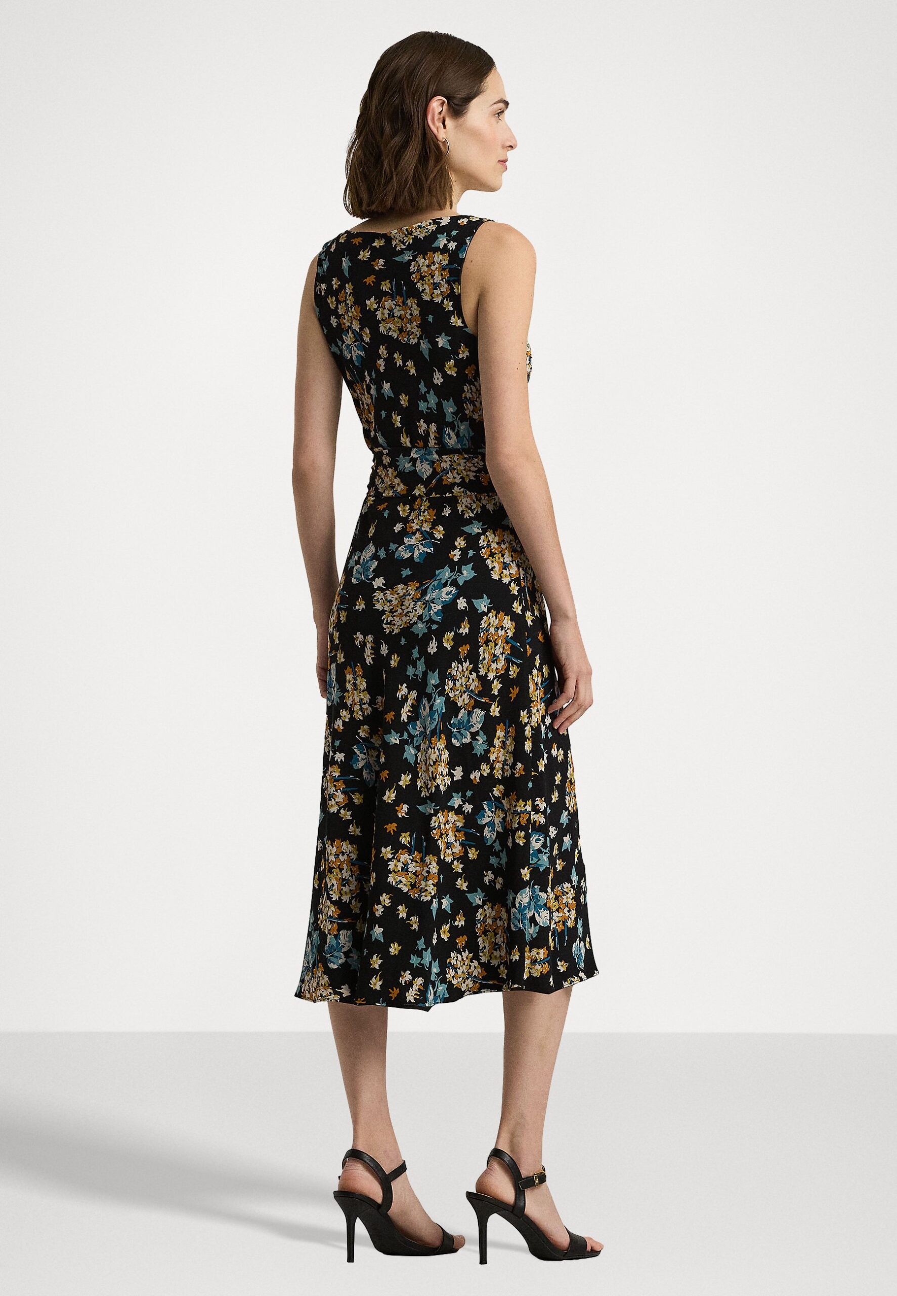 FLORAL BELTED CREPE SLEEVELESS DRESS – Day dress – black multi