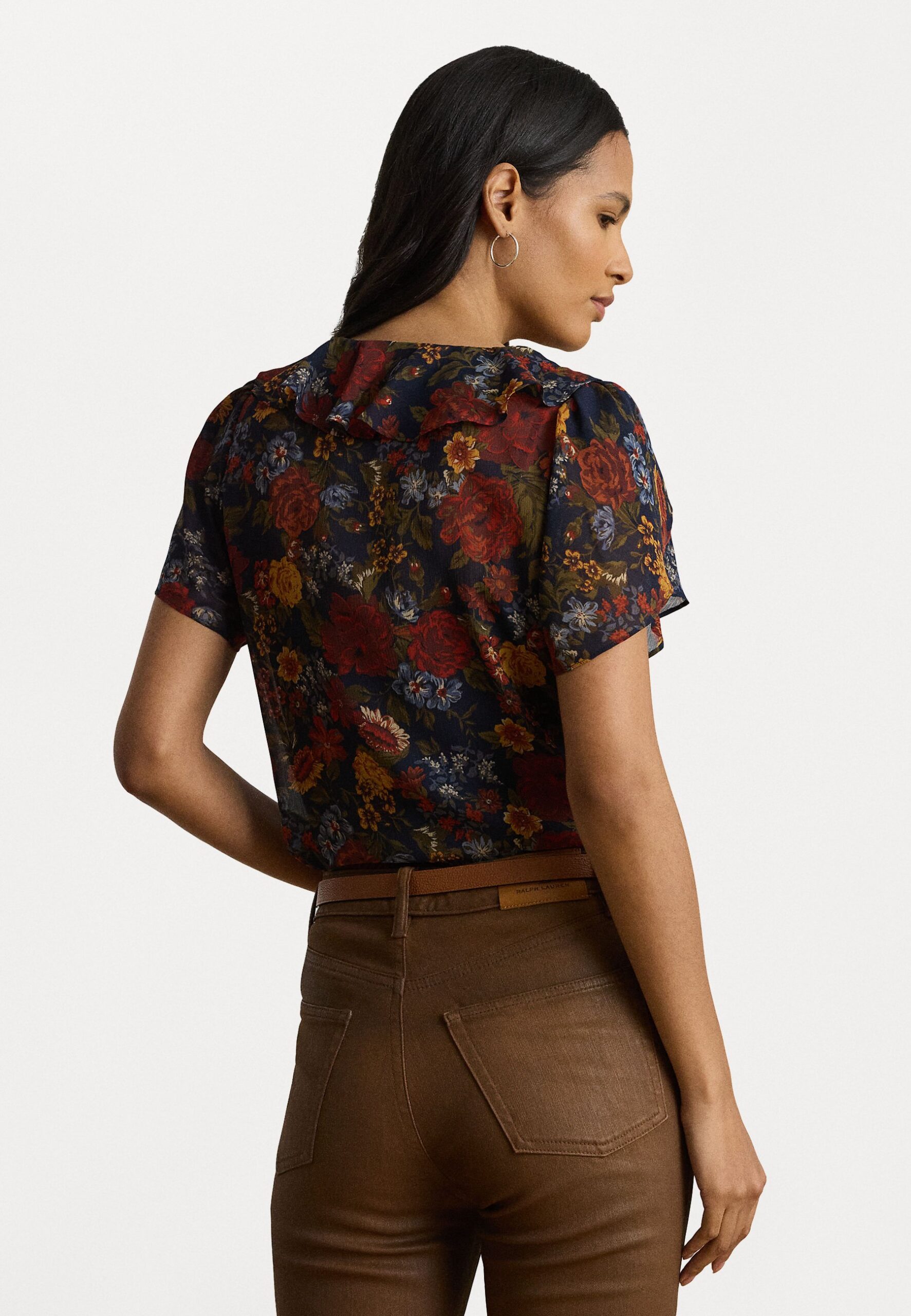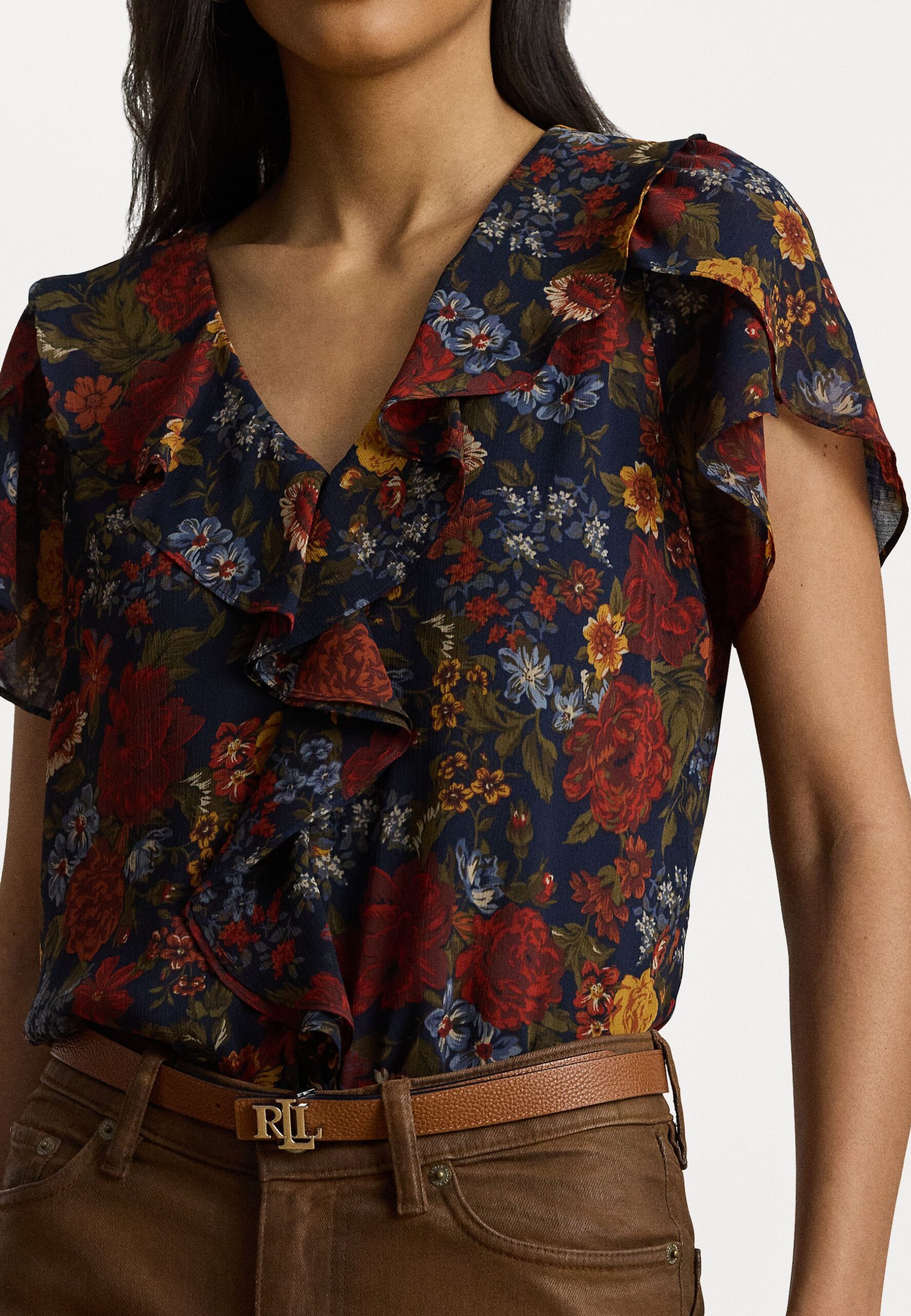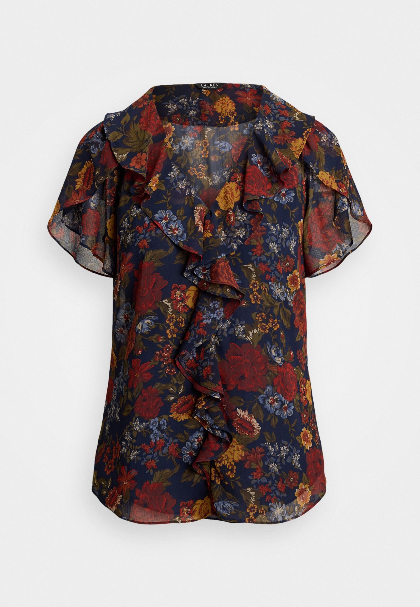FLORAL RUFFLE TRIM GEORGETTE BLOUSE – Blouse – navy/multi-colored