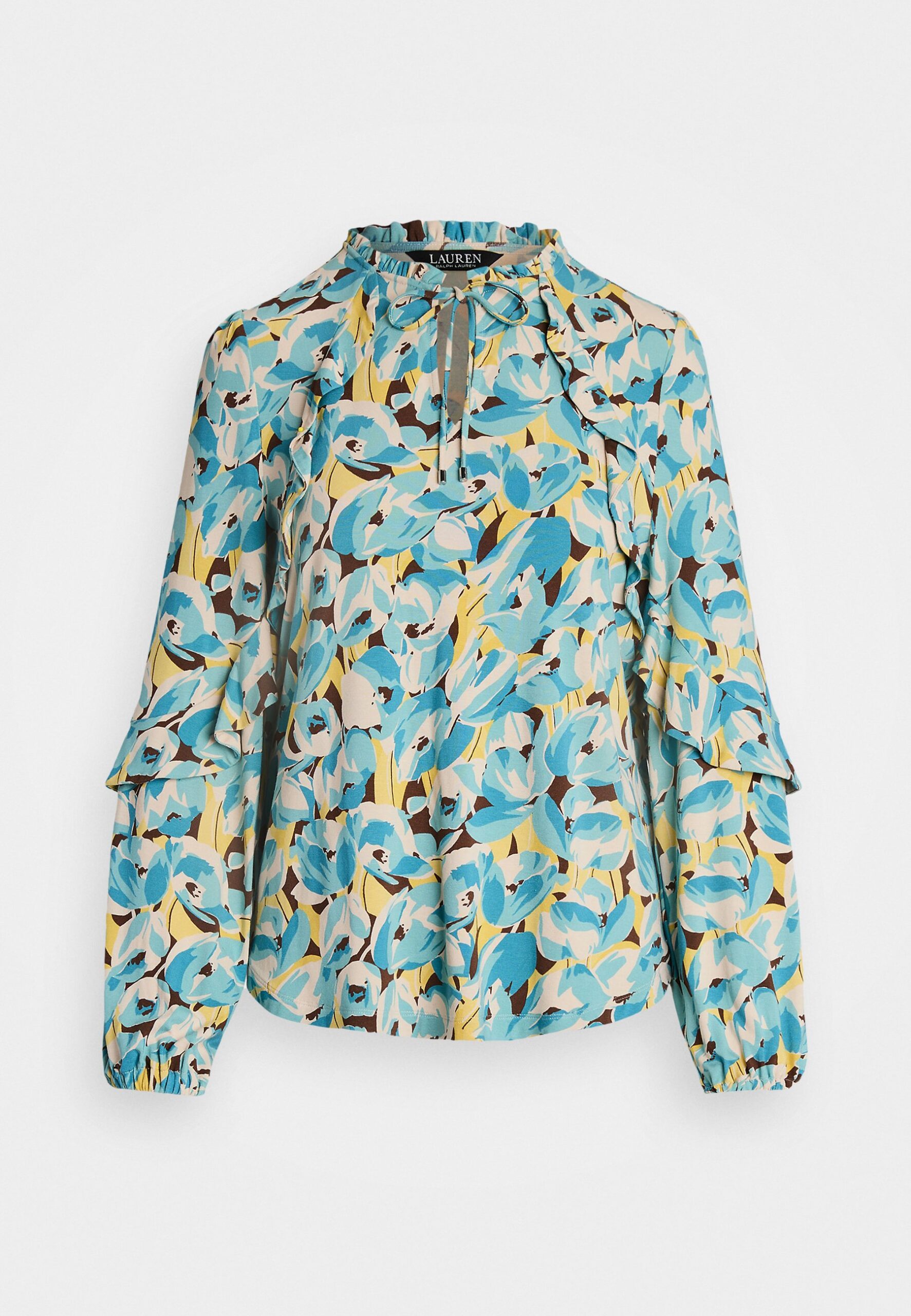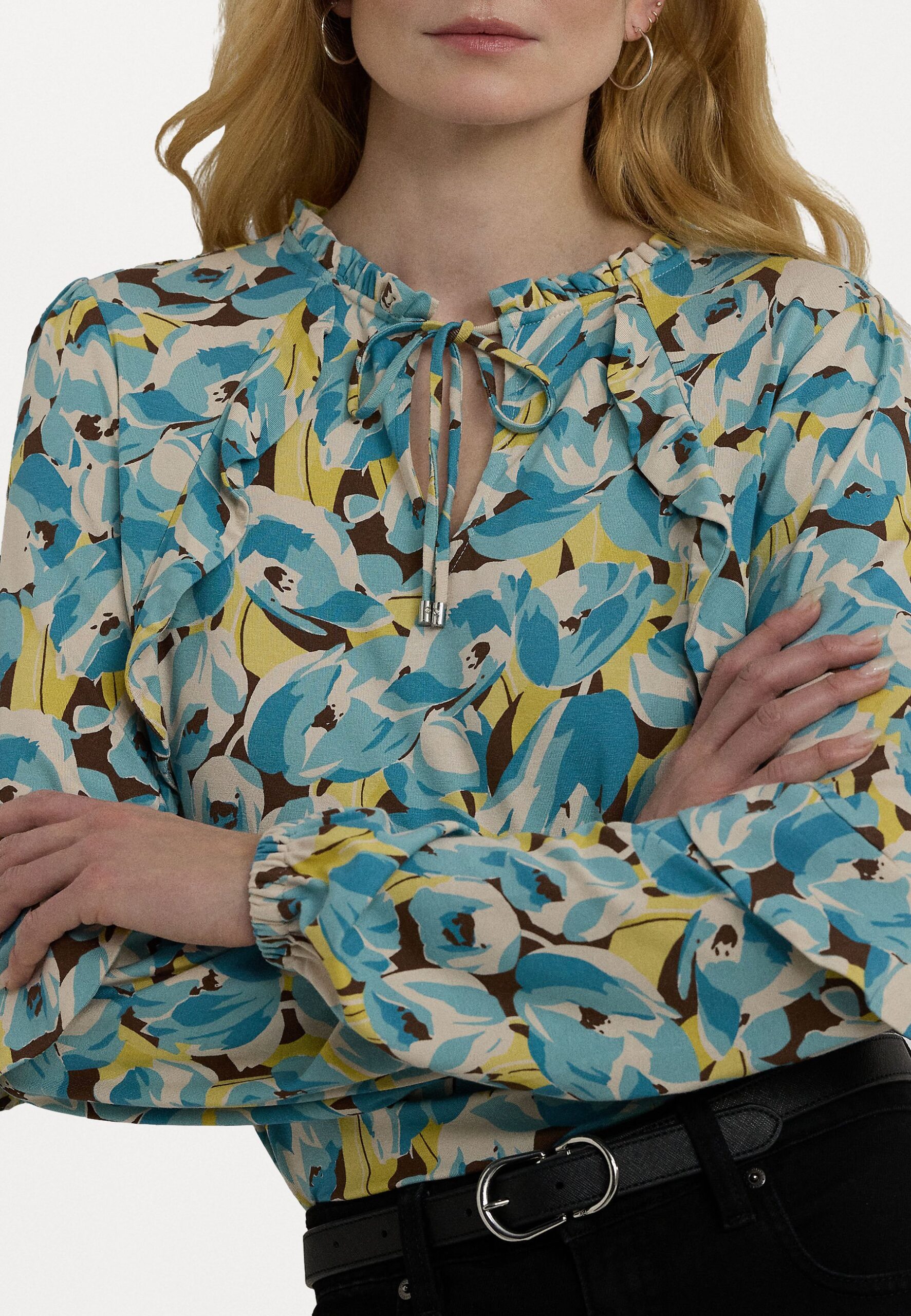 FLORAL RUFFLE TRIM JERSEY TIE NECK TOP – Long sleeved top – cream multi