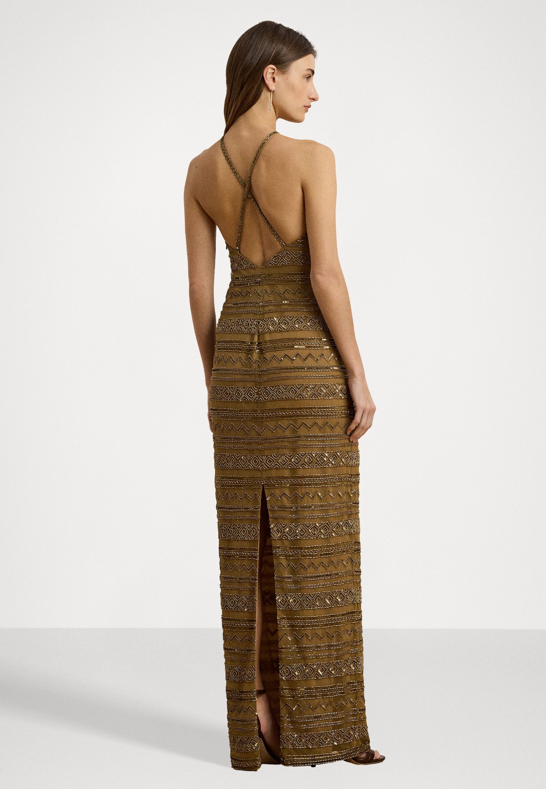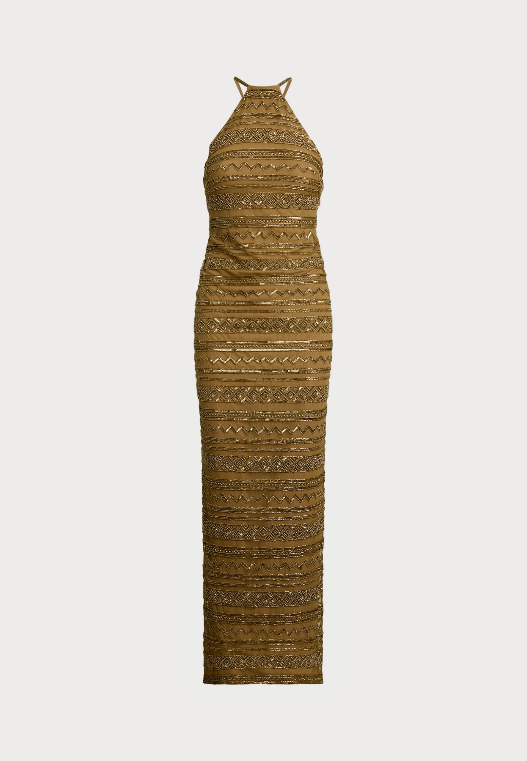 JARAL BEADED MESH HALTER GOWN – Occasion wear – tan
