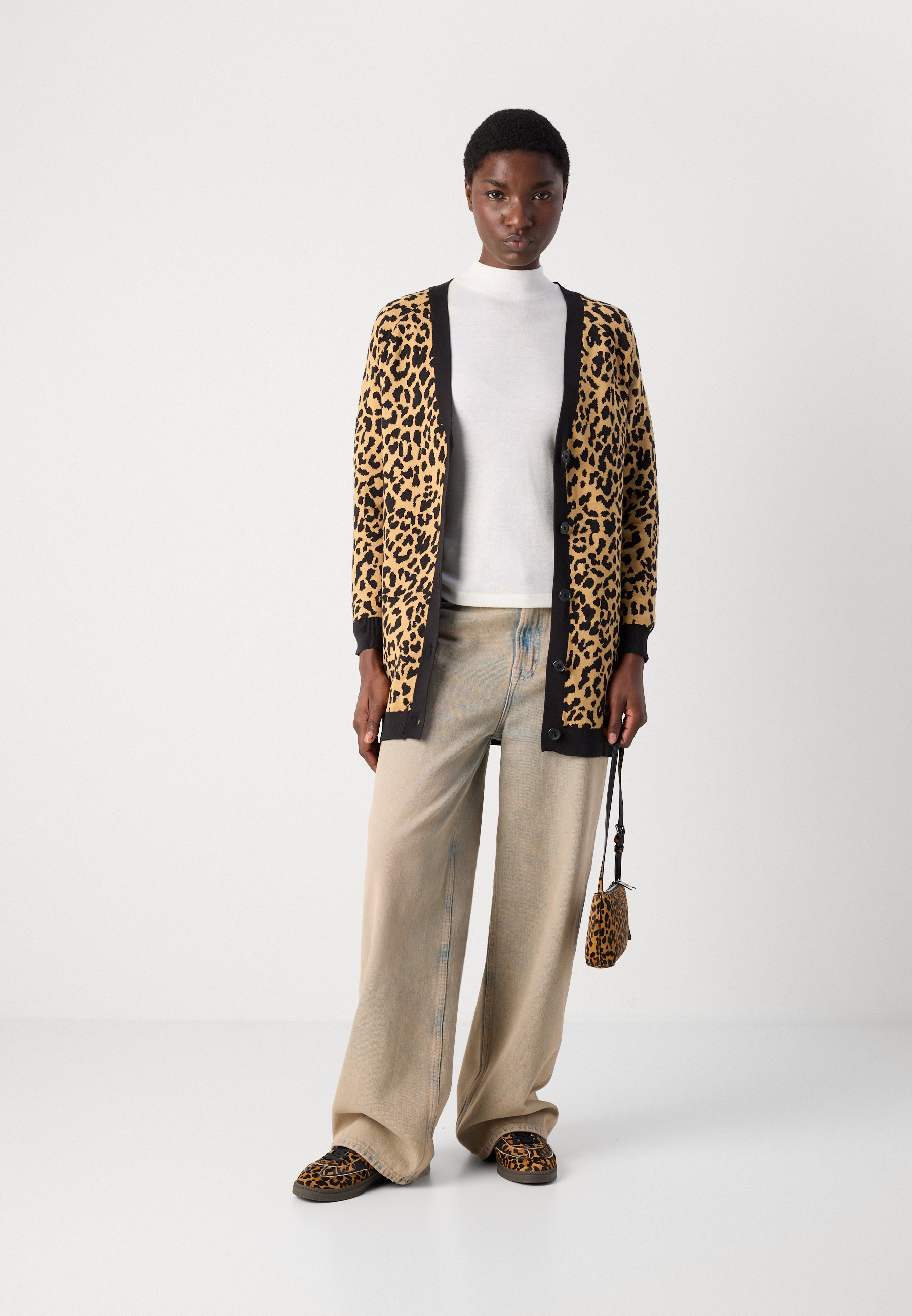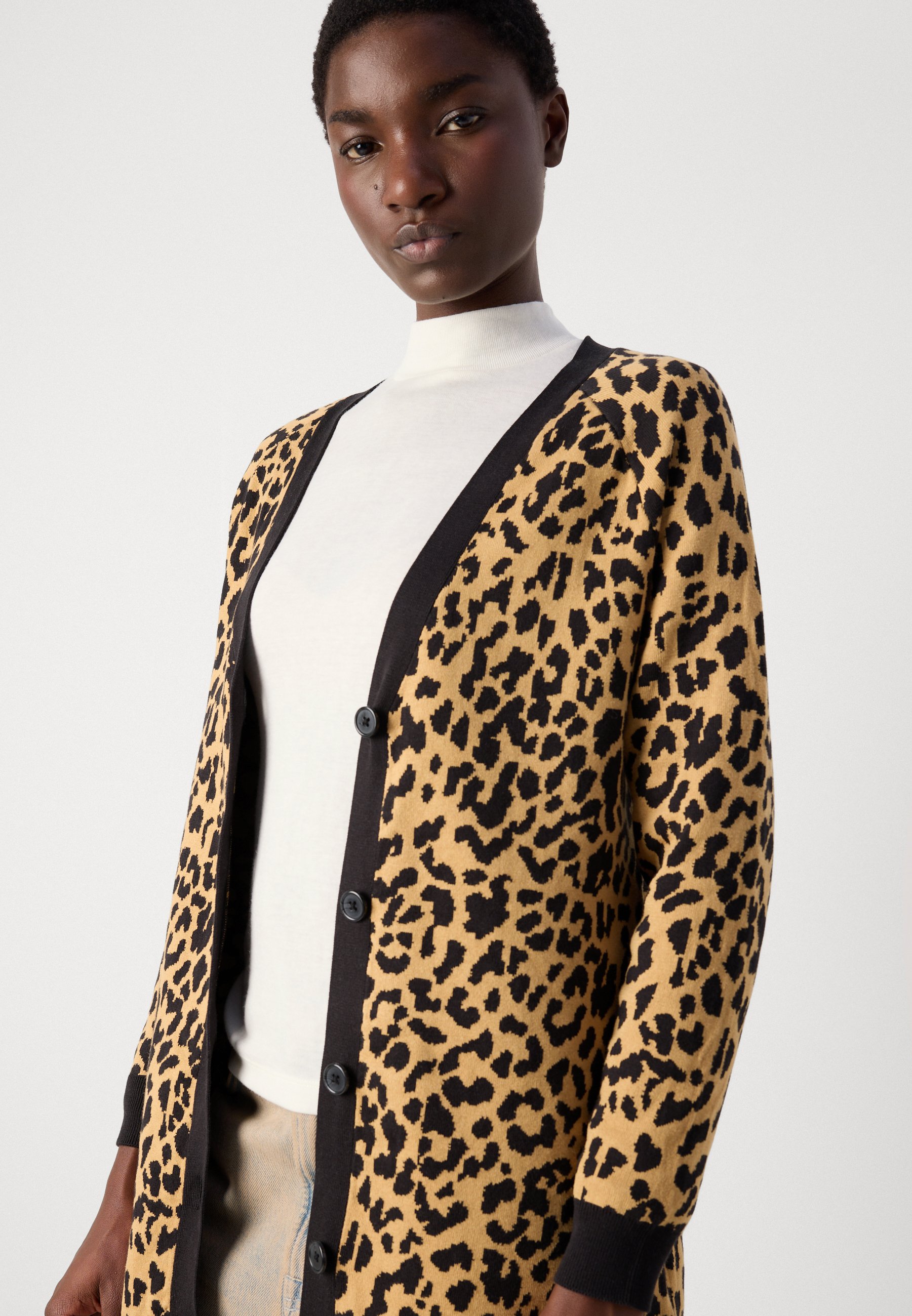 LONG SLEEVE V NECK CHEETAH CARDIGAN – Cardigan – whiskey/black