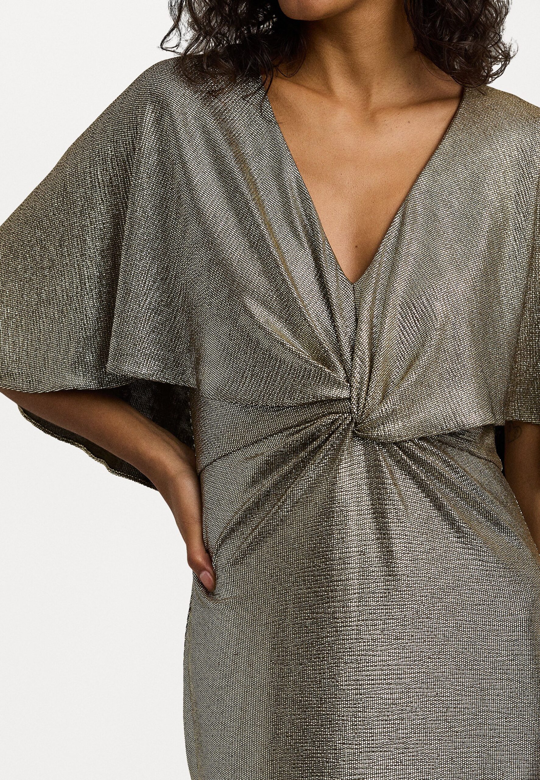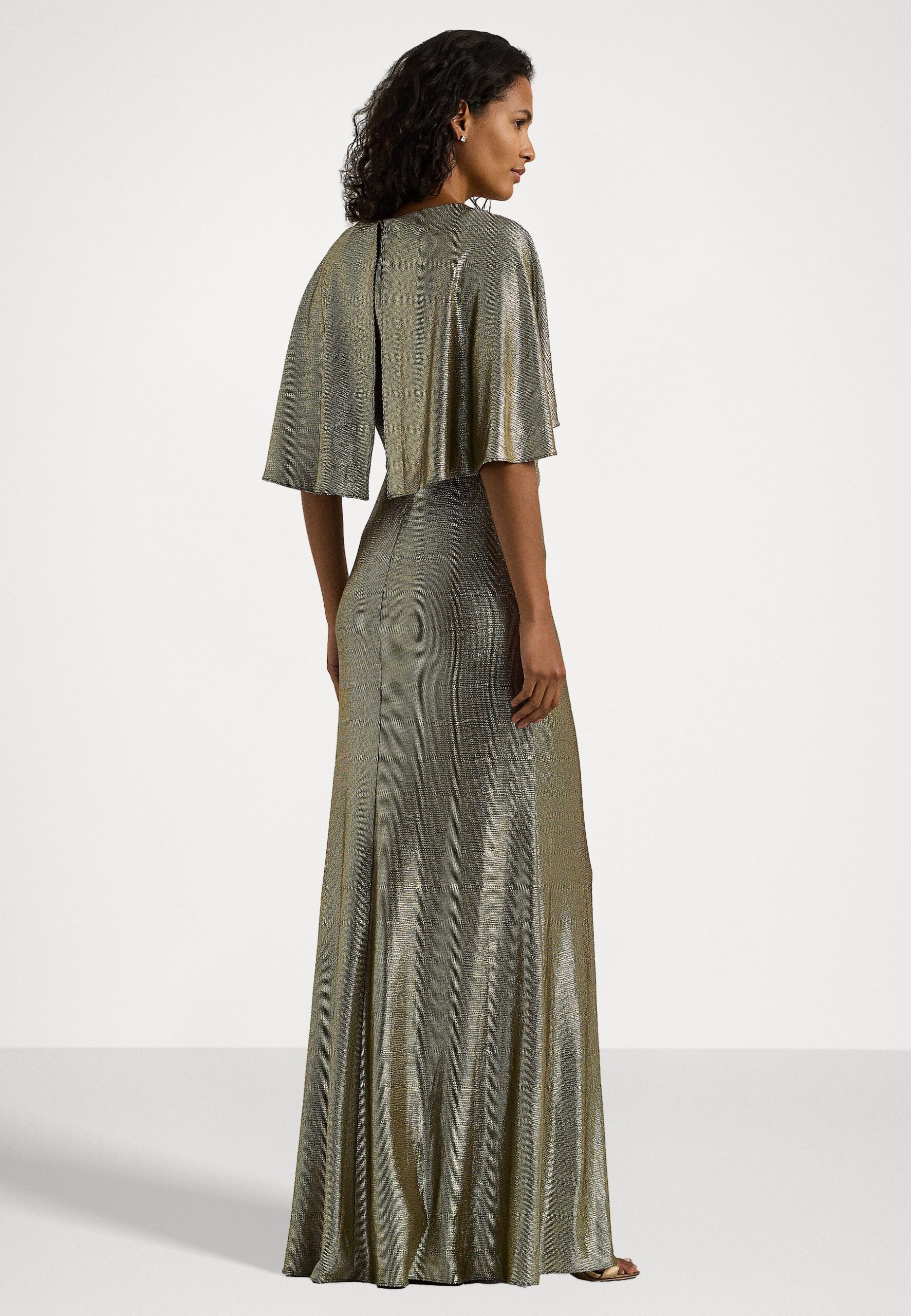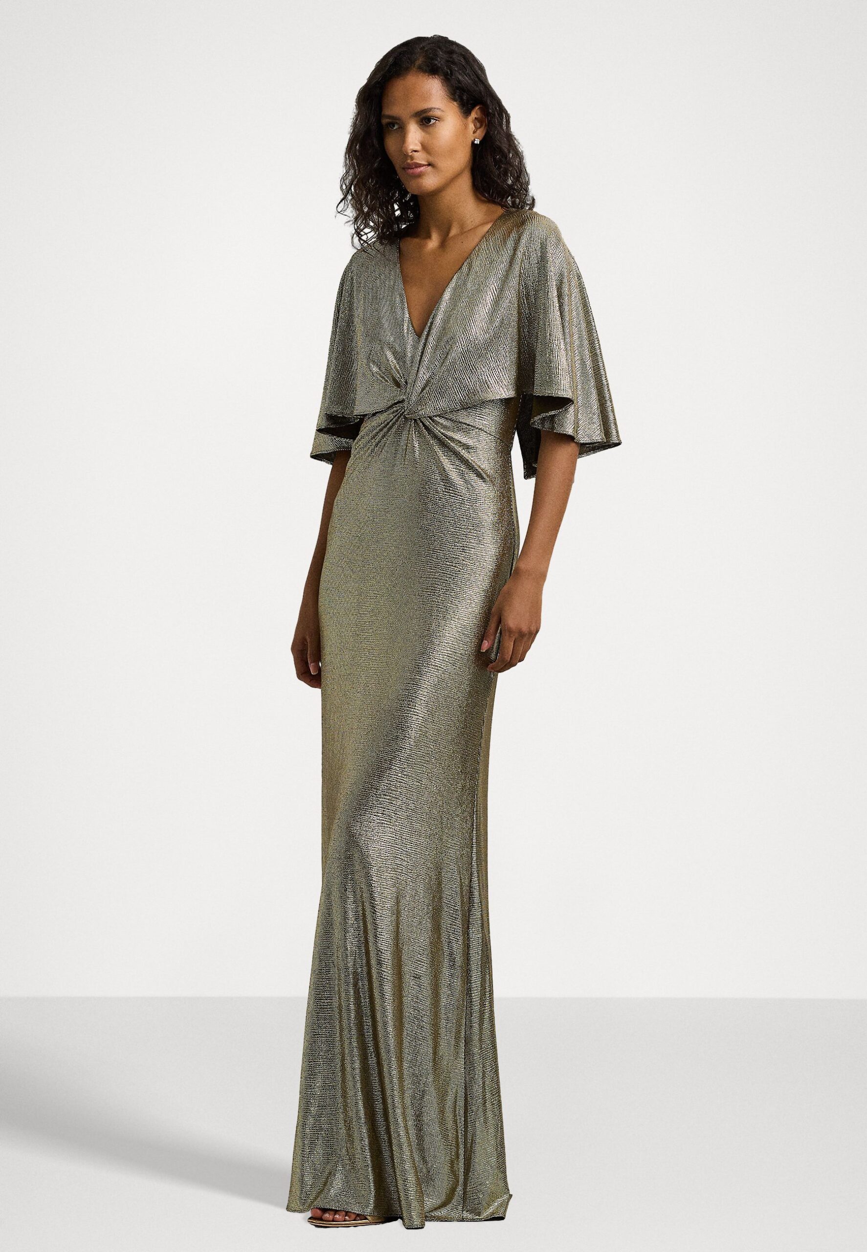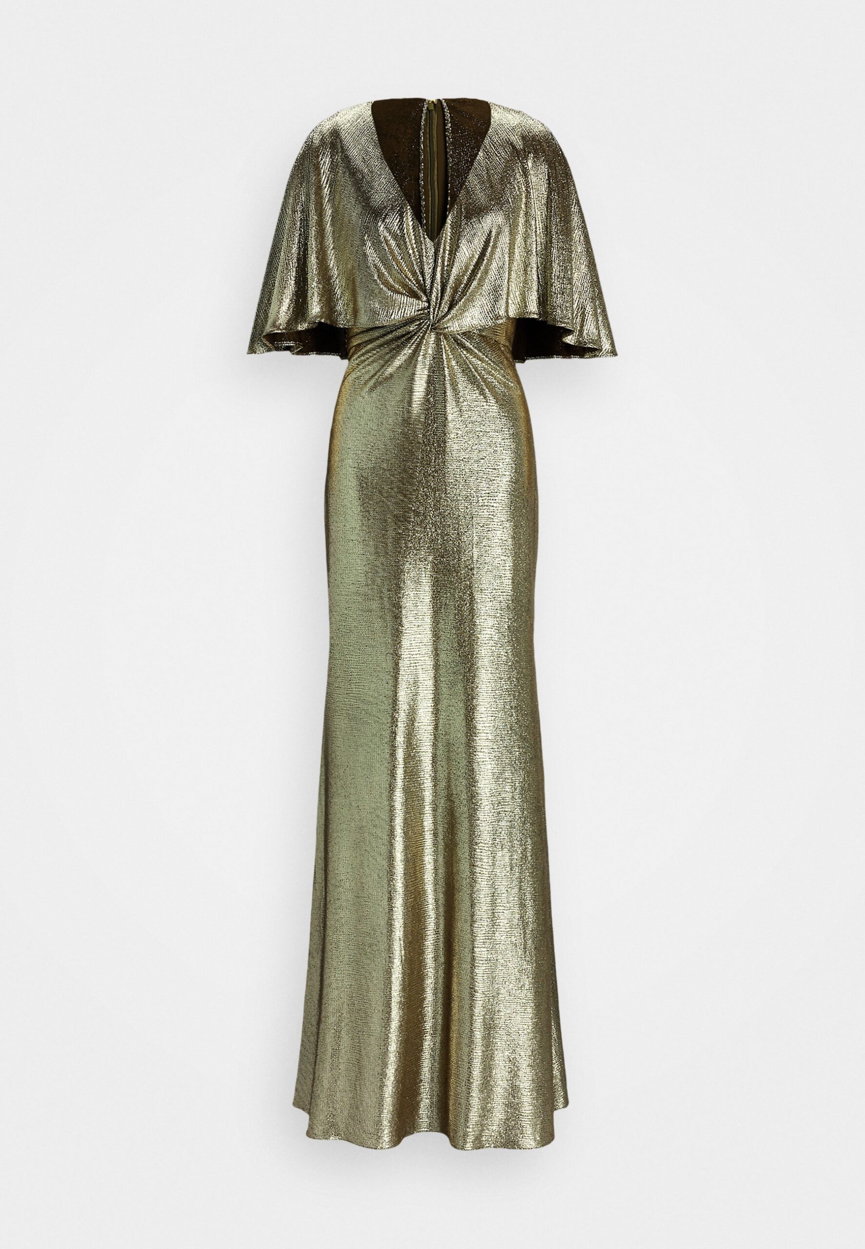 METALLIC KNIT TWIST-FRONT CAPE GOWN – Occasion wear – botanic green/gold-coloured