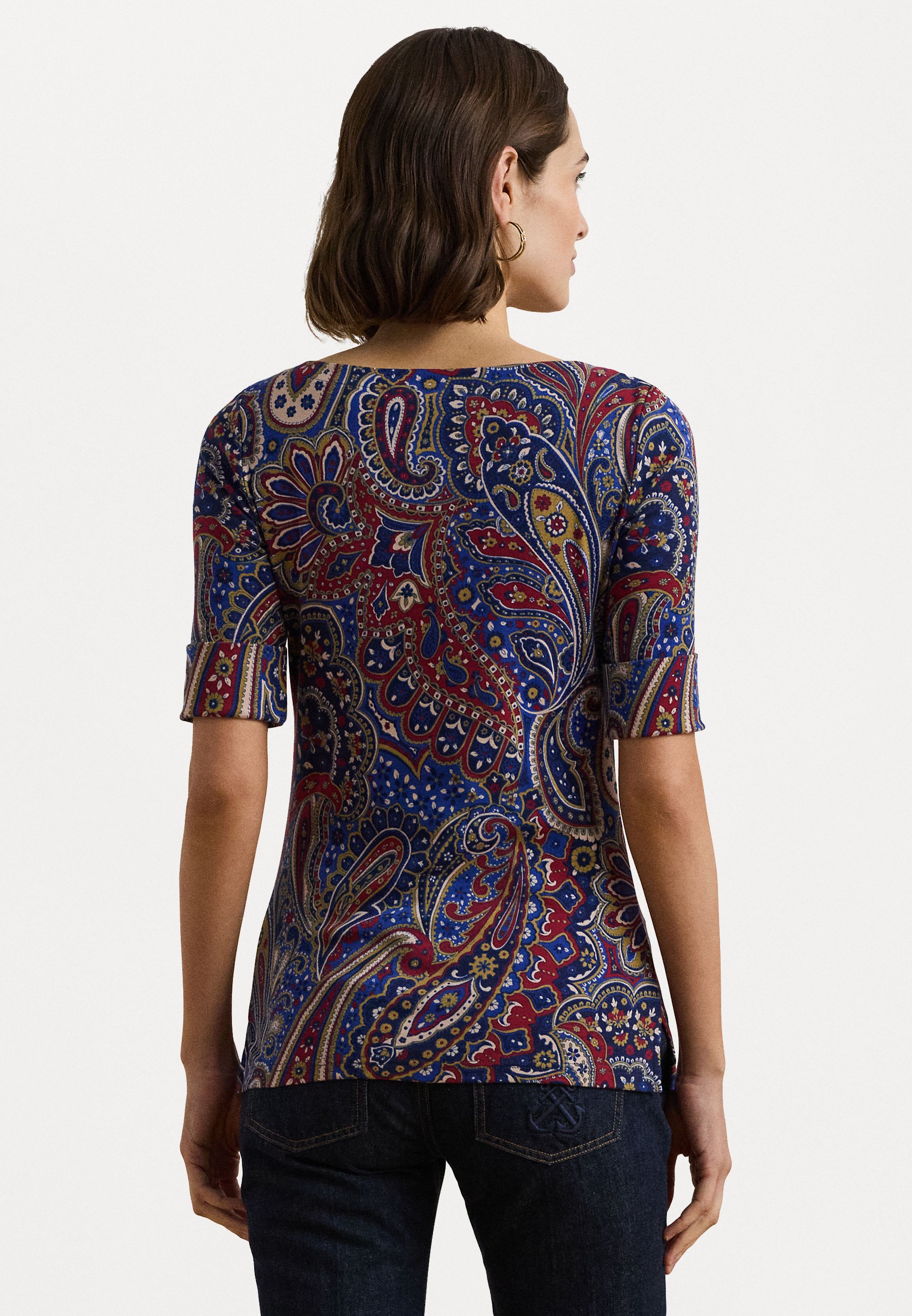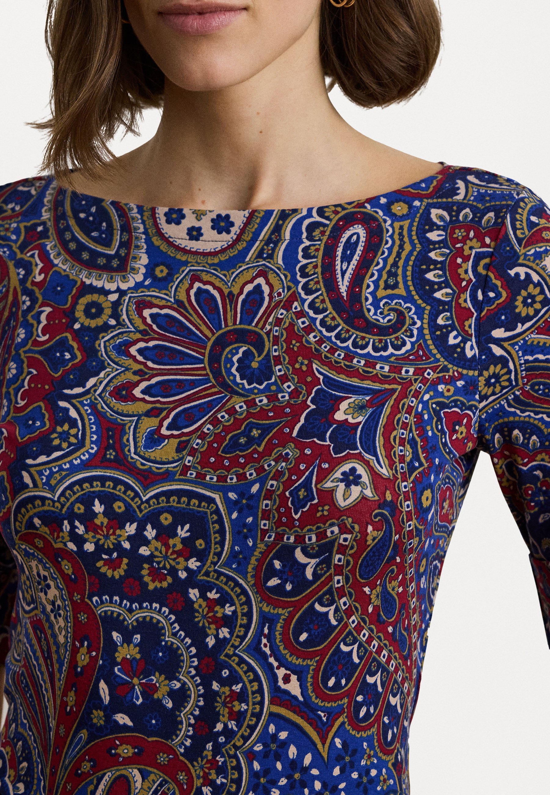 PAISLEY STRETCH COTTON BOATNECK TEE – Print T-shirt – blue/red/cream