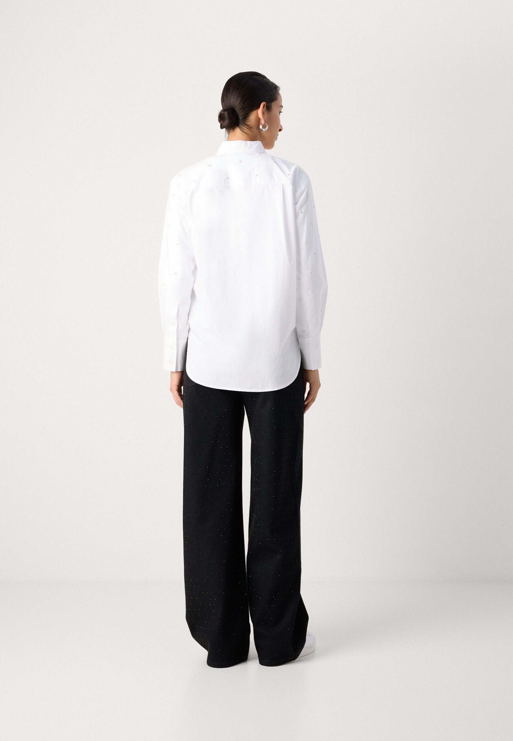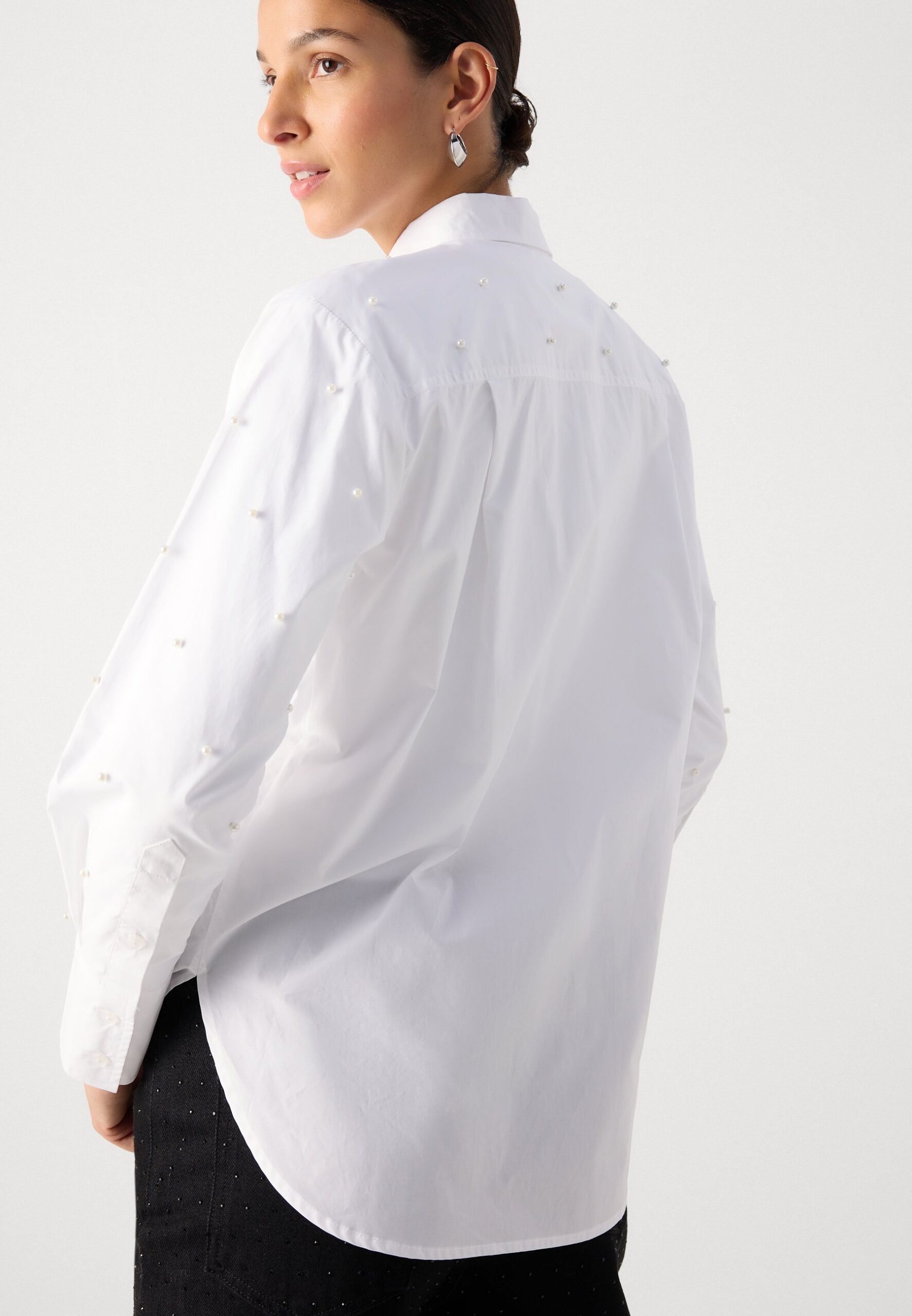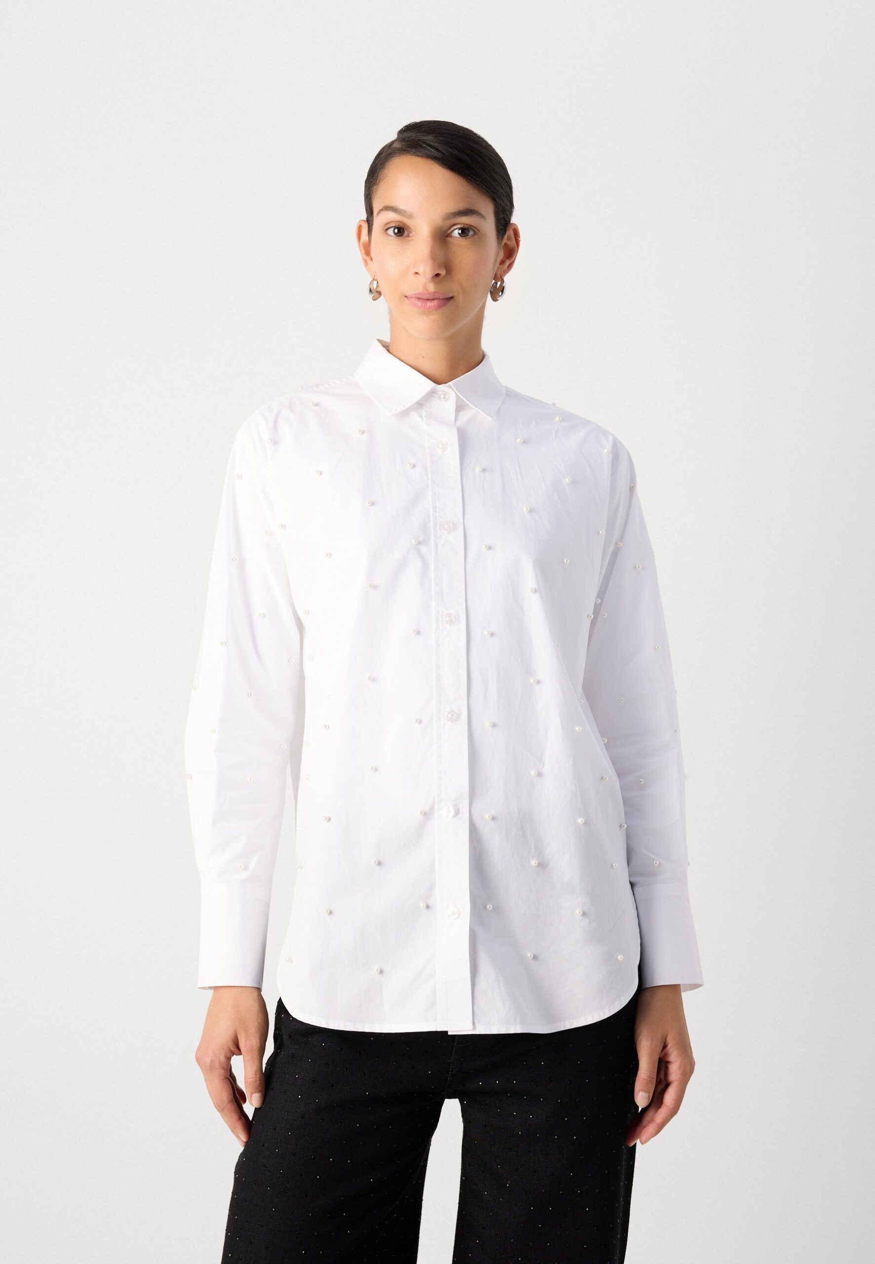 PEARL EMBELLISHED LONG SLEEVE BUTTON FRONT SHIRT – Button-down blouse – white