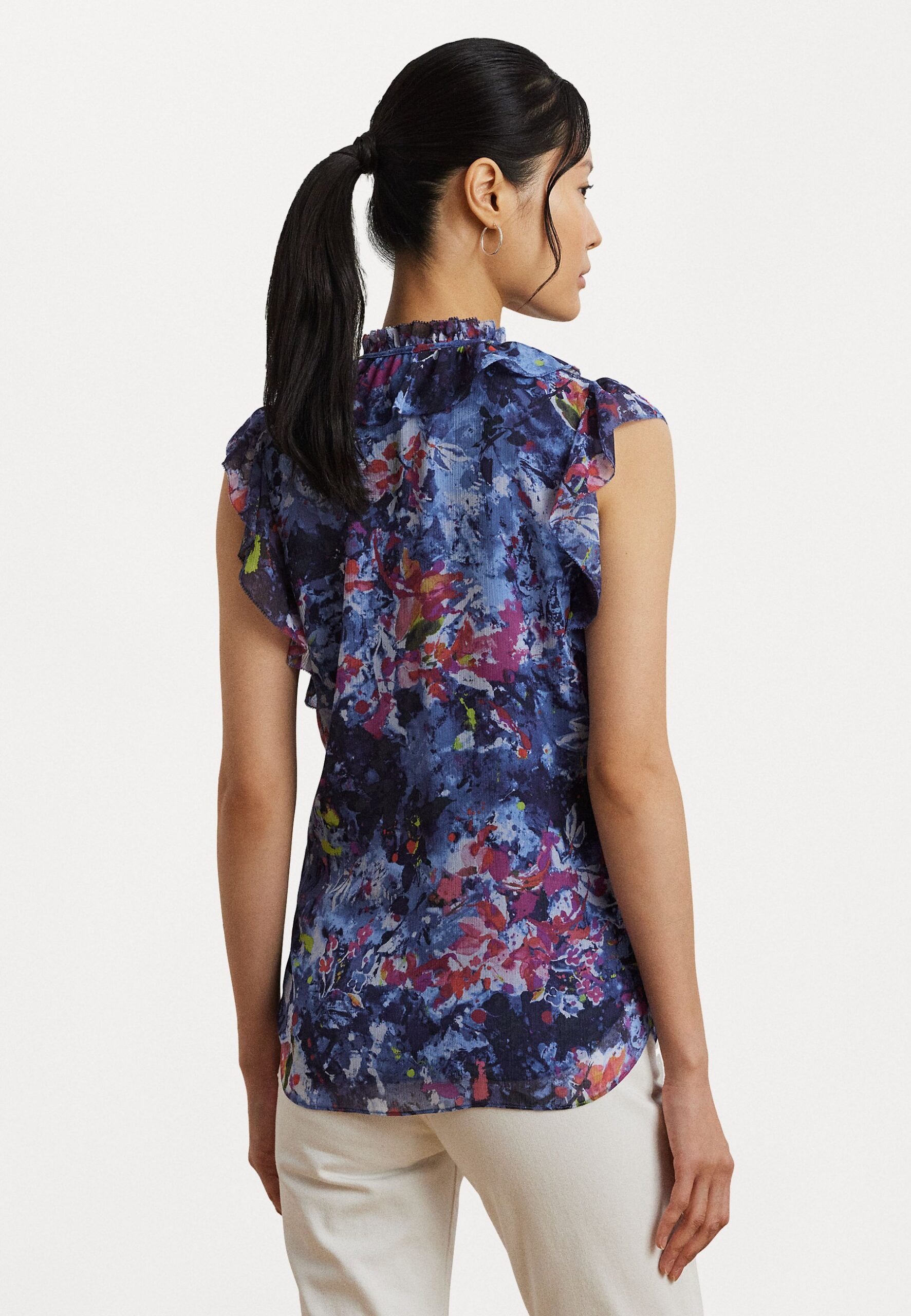 Print Ruffle Trim Georgette Blouse – Blouse – blue