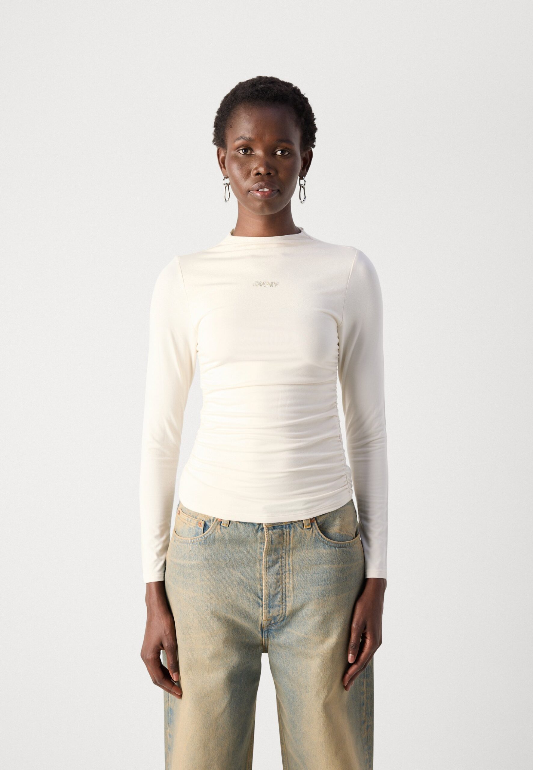 SIDE RUCHED HIGH NECK RHINESTUD LOGO – Long sleeved top – eggnog/champagne