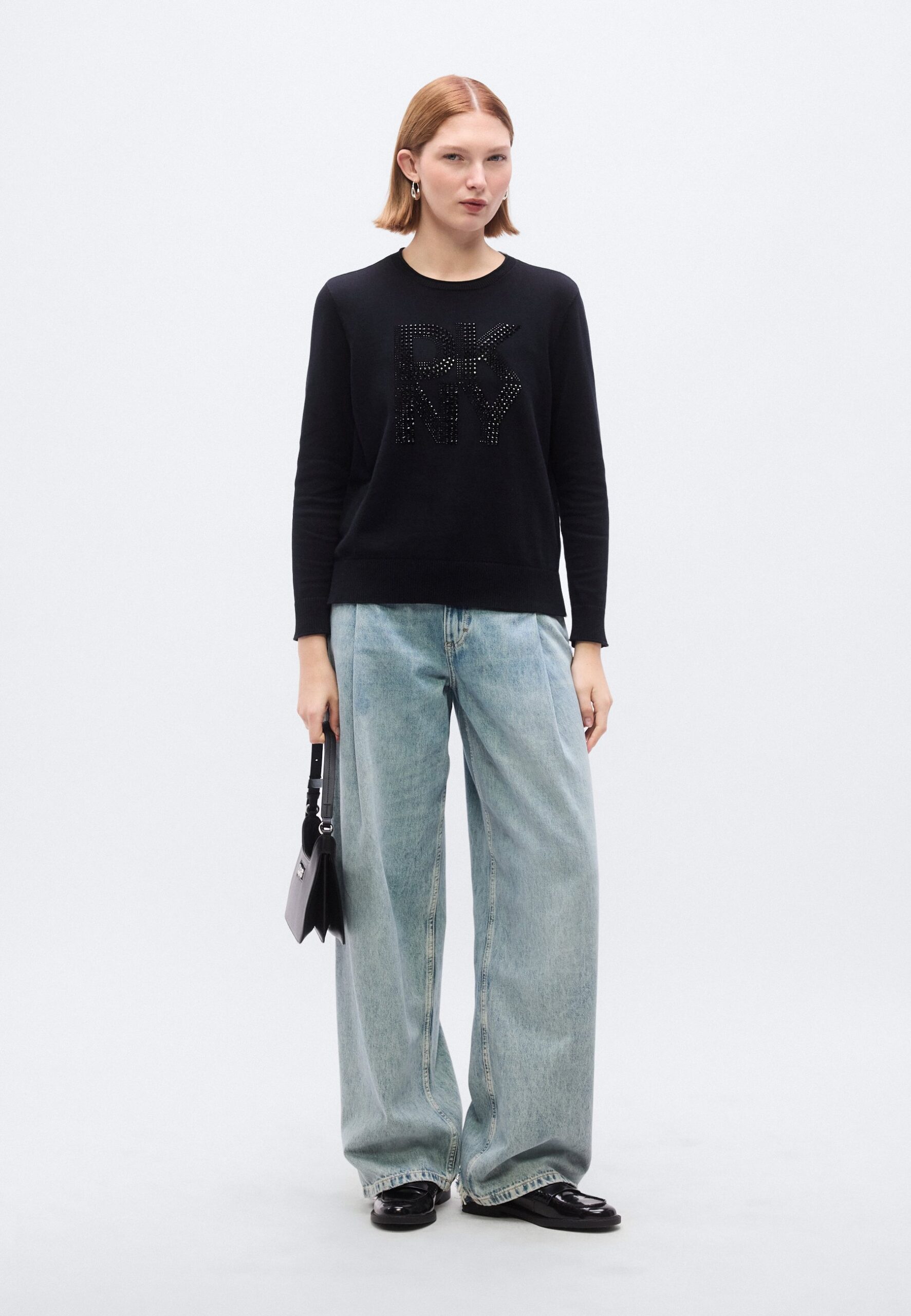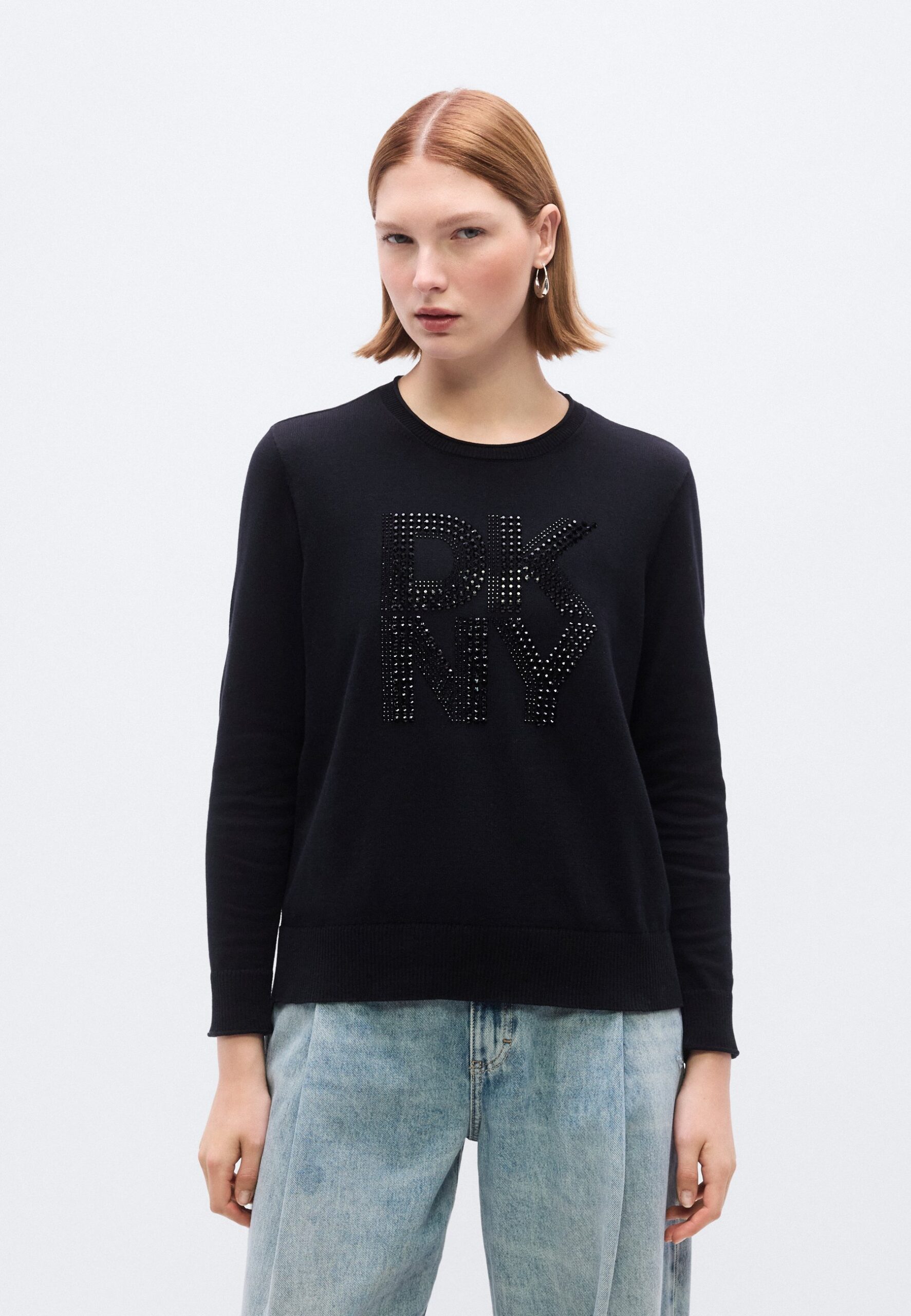 STACKED RHINESTONE EMBELLISHED LOGO LONG SLEEVE CREW NECK SWEATER – Jumper – black