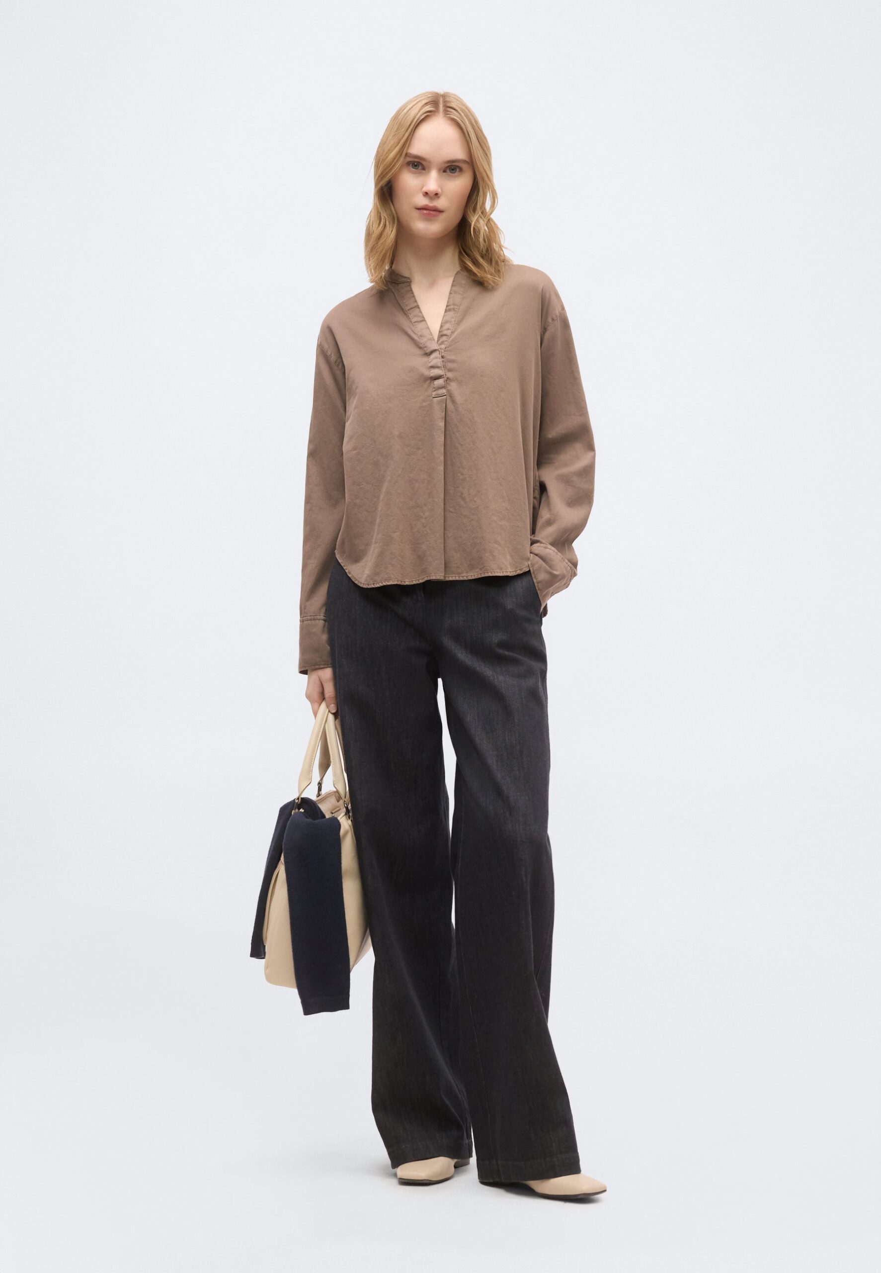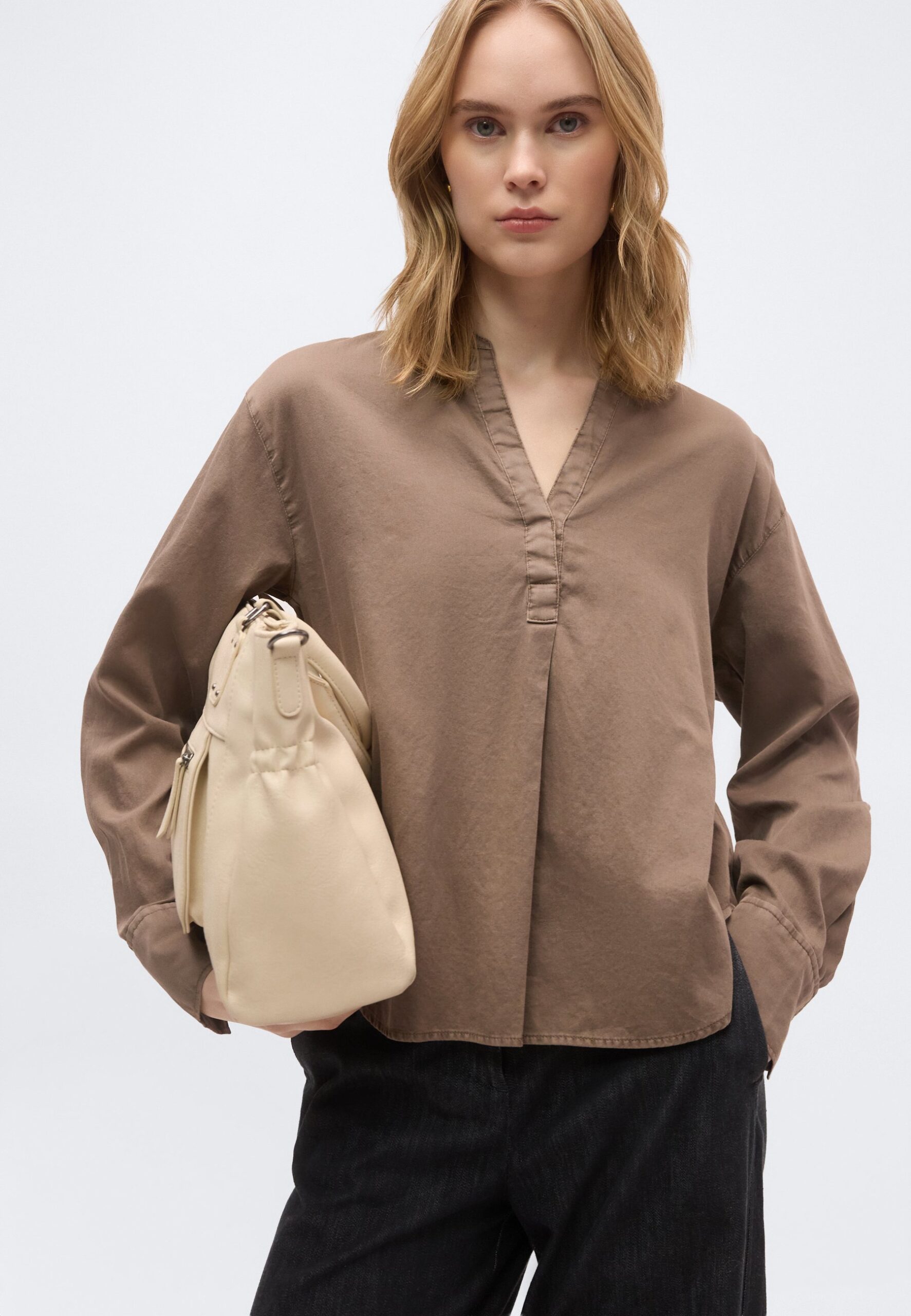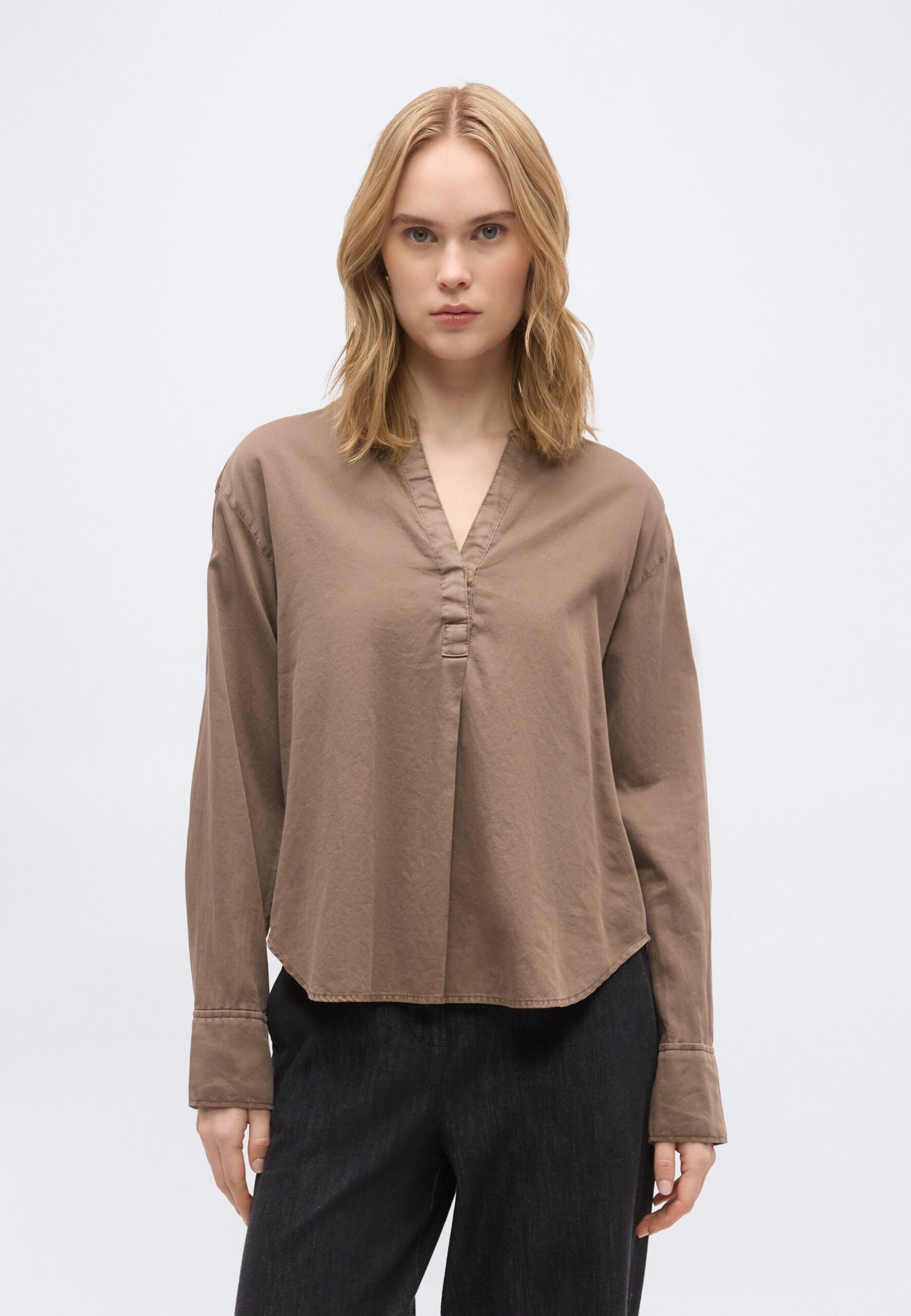 STAND UP COLLAR LONG SLEEVE GARMENT DYED SOLID – Blouse – chalky brown